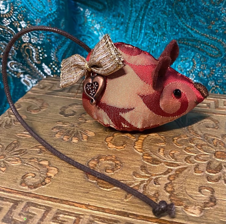 These fairytale mice are hand stitched to a pattern of my own design from scraps of vintage silk brocade. Their bodies are roughly 7-8cm long and stuffed with recycled polyester filling. They have felt ears, glass bead eyes, repurposed cord tails and hand embroidered nose and mouth. Each one is unique and adorned with a bow and repurposed or vintage beads and charms.