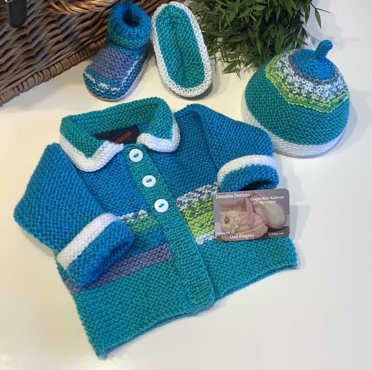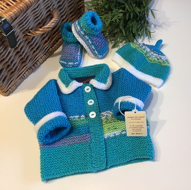The set has been lovingly designed and hand crafted using quality branded machine washable yarns. The jacket is nice and long covering the lower body for extre cosy warmth during wear. This set will be ideal for an expected Autumn and winter baby.