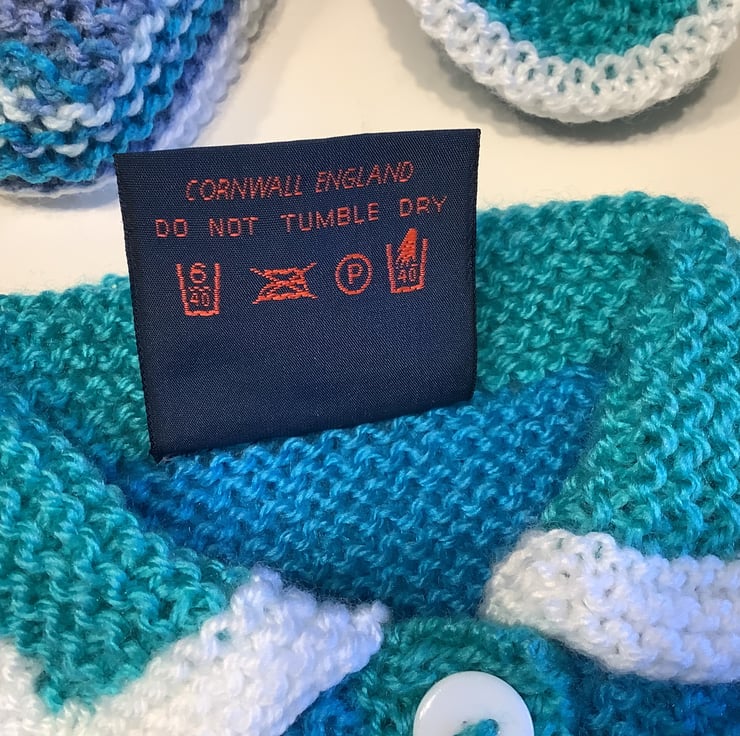 Baby knitwear is designed and hand crafted by Demelza Designs in Cornwall meeting UK baby safety standards, Only branded premuim acylic, acrylic/natural fibre blends or pure natural fibre yarns are used in baby knitwear which conforms to BS984/76 standards.