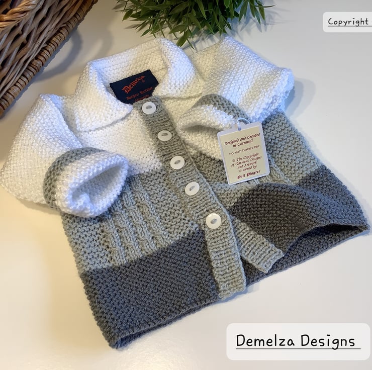 A very unique hand knitted baby cardigan designed and hand crafted in Cornwall using quality branded machine washable British and French manufactured yarns. I have designed this product for either sex, especially if gifting for the first born within a family network to be handed down at a later date. The cardigan has the designer garment label attached to the back neck edge with the care instructions woven within it for lasting reference and as proof of it's origins.