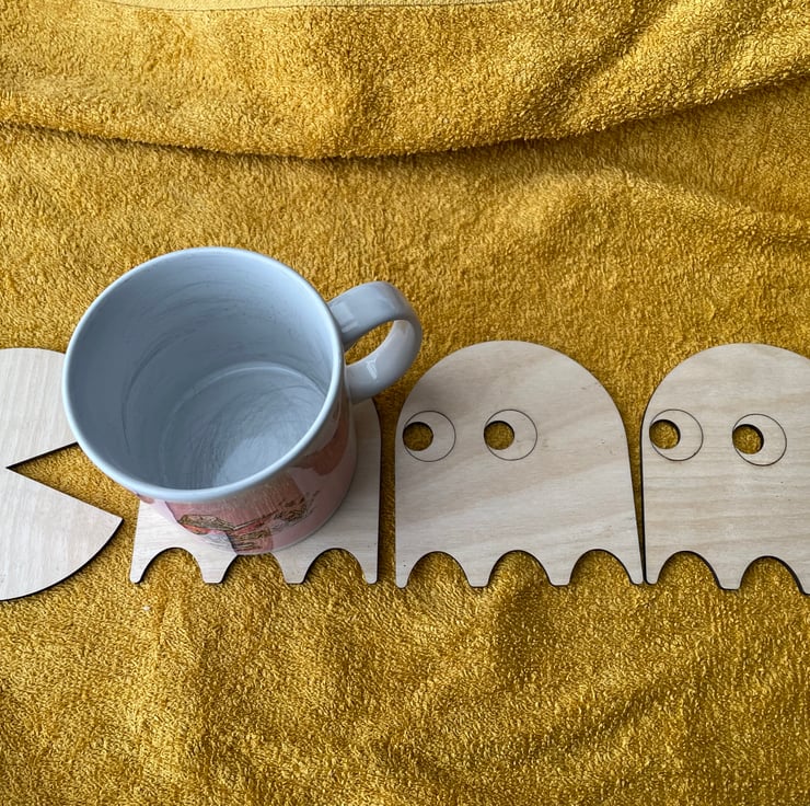 A different take on a coaster design. Pac-Man can forever be trying to outrun those ghosts on your very own kitchen table!