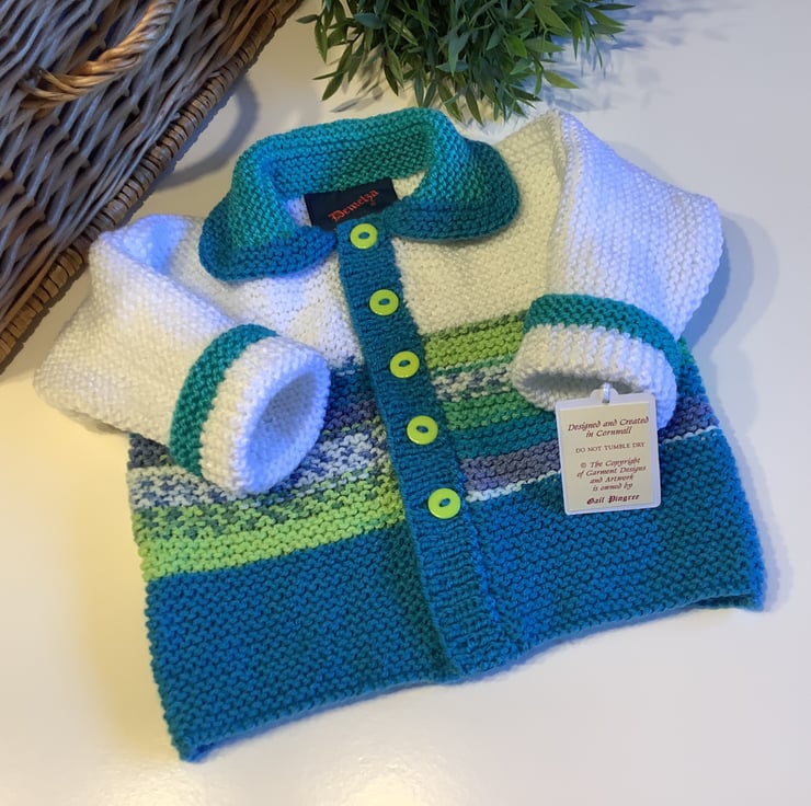 A very unique baby cardigan designed and hand crafted using quality branded machine washable British and French manufactured yarns. I have designed this product for either sex babies, especially if gifting for the first born within a family network. The cardigan has the designer garment label attached to the back neck edge with the care instructions woven within it for lasting reference and as proof of it's origins.