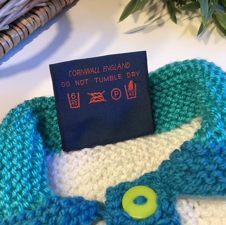Baby knitwear is designed and hand crafted by Demelza Designs in Cornwall meeting UK baby safety standards, Only branded premuim acylic, acrylic/natural fibre blends or pure natural fibre yarns are used in baby knitwear which conforms to BS984/76 standards.