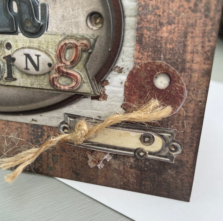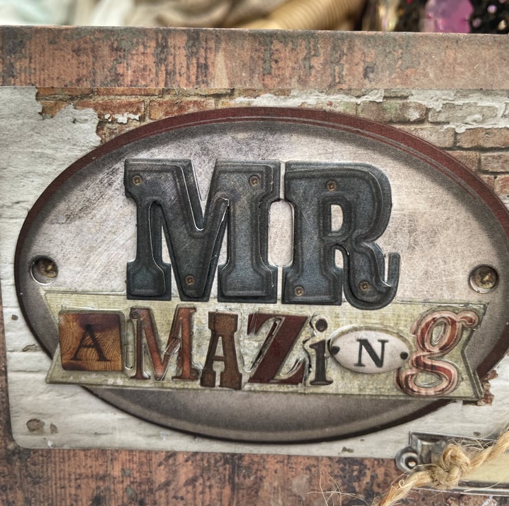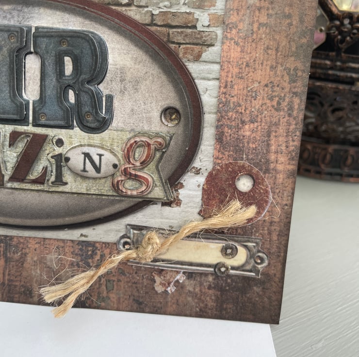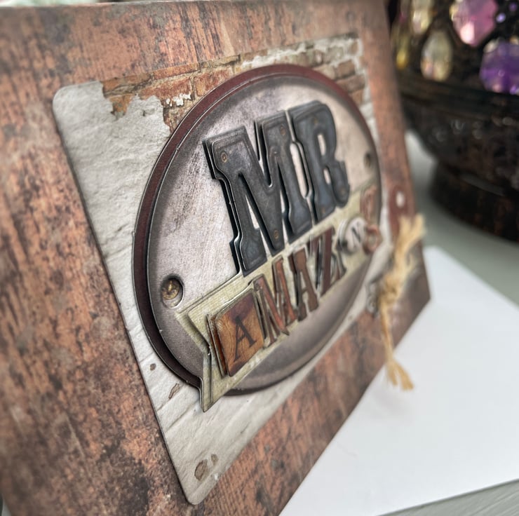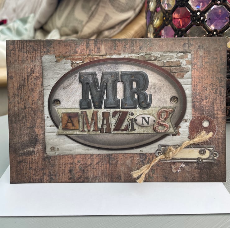 A super card for the workshop DIYer in your life. This A6 sized card features a worn wood background. This is topped with a layered plaque with a flaky painted wall and this is topped with the words Mr Amazing. The design is finished with some paper embellishments of a name plate, key and some twine. The base card is kraftcard and there is no greeting on the front or inside making it a versatile card for birthdays or Father's day.