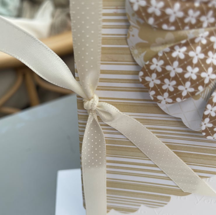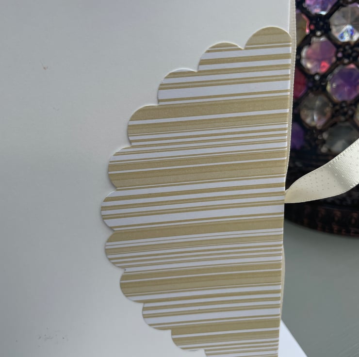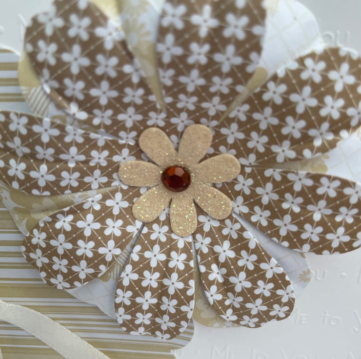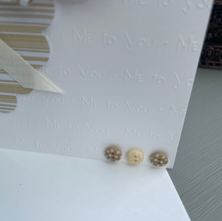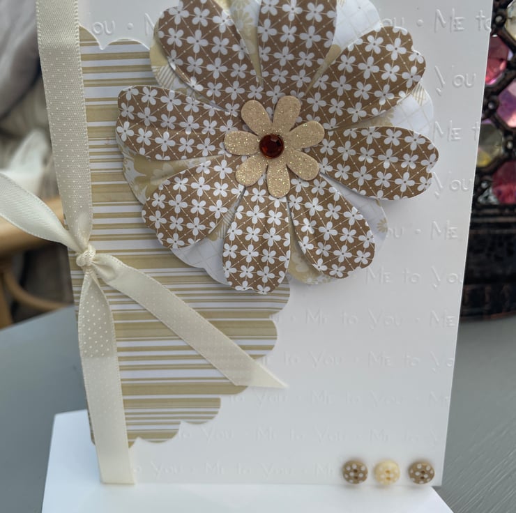 A beautiful and simple card to send greetings to a loved one. This A6 sized card is simple and classic. The base card is pure white and embossed with the words For you all over the front. This is topped with a scalloped die cut circle folded on the fold of the card. This has a spotted pale yellow ribbon knotted over it. There is a double layered paper flower in matching papers. This has a smaller flower in sparkle paper with a gem centre. The design is finished with 3 mini buttons decorated with dots. There is no greeting to make this a versatile design.