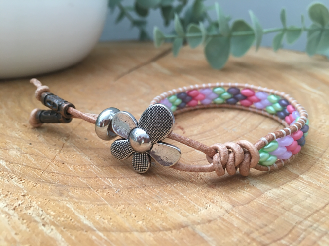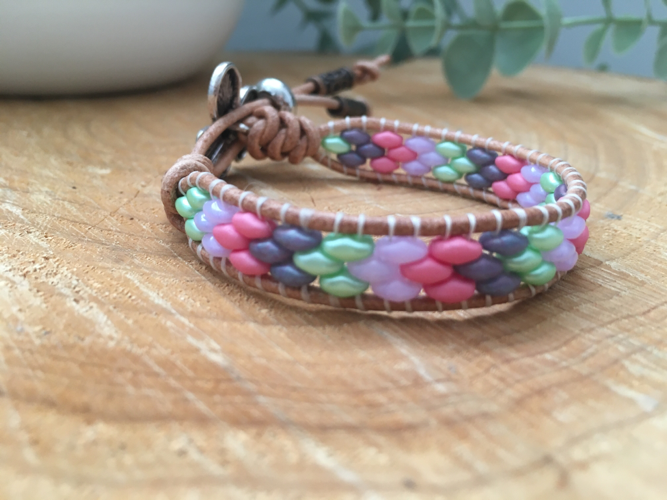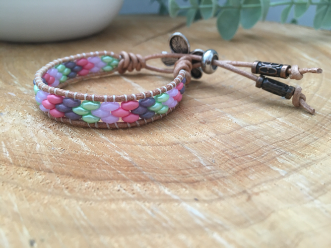 To create this design I have lovingly woven Czech Super duo glass beads in pretty pastel tones of pink ,green, lilac and grey, onto 1.5 mm soft Italian leather cord. Czech beads are considered to be of the highest quality for durability and depth of colour.
