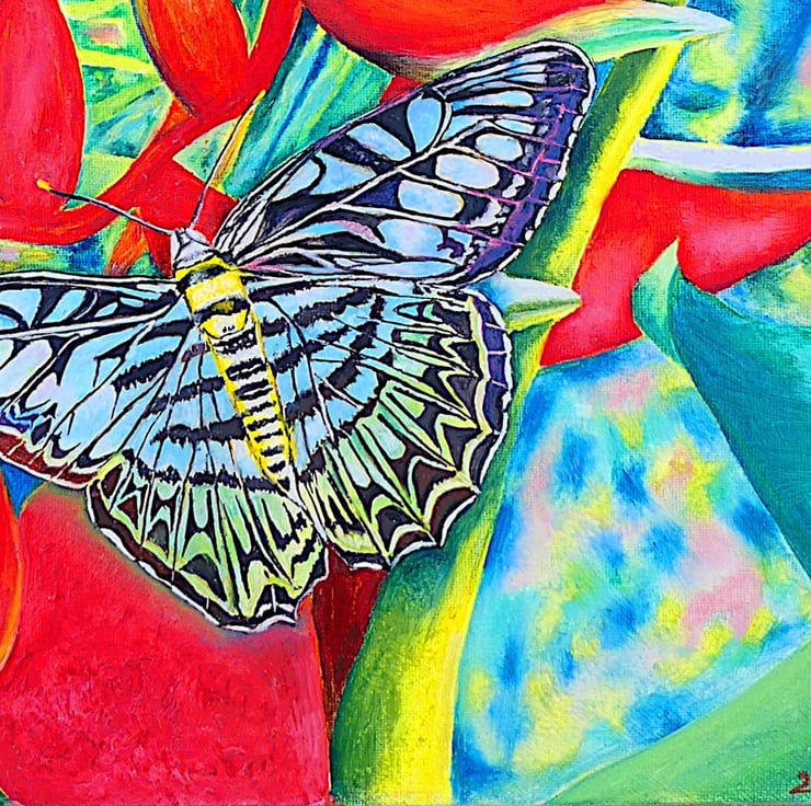 This composition in oils of a Blue Clipper butterfly on a Heliconia bract encompasses many elements..