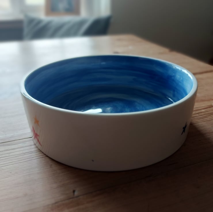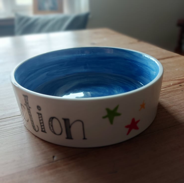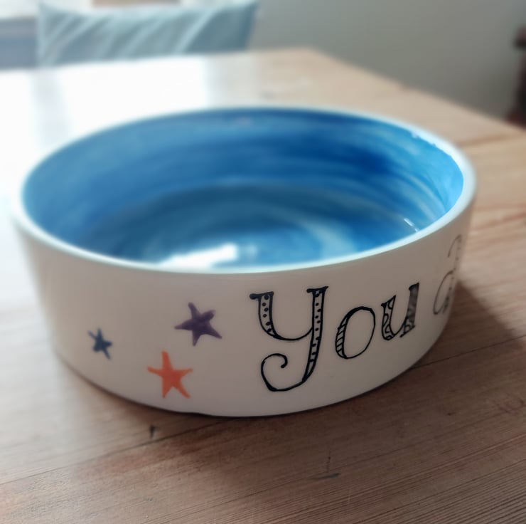 Customisation Options: This bowl features a coloured interior; please select your preferred colour from the drop-down menu. The exterior is white with black lettering and your choice of coloured stars, making it easy to coordinate with your kitchen decor. The bowl includes the phrase "You are pawfection," along with your pet’s name in the same stylish black lettering.