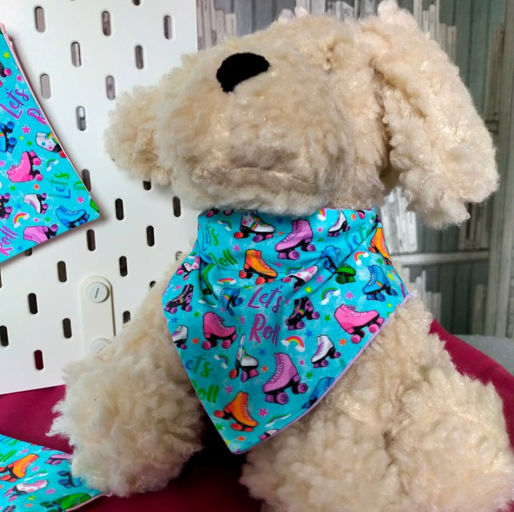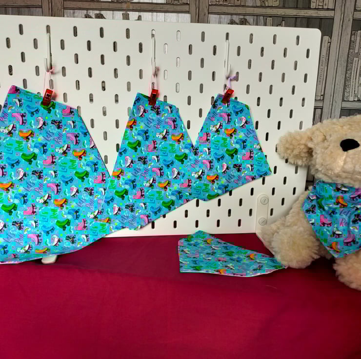 This fun, over-the-collar bandana is made from digitally printed 100% cotton using eco-friendly water-based inks. It has an all over design of roller skates/roller derby theme and has either pink or lilac polycotton on the reverse.