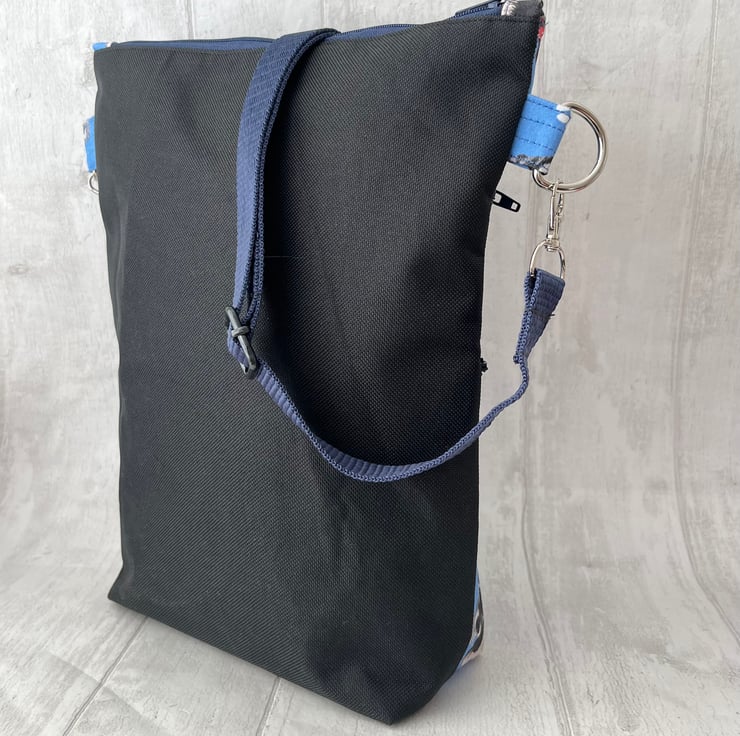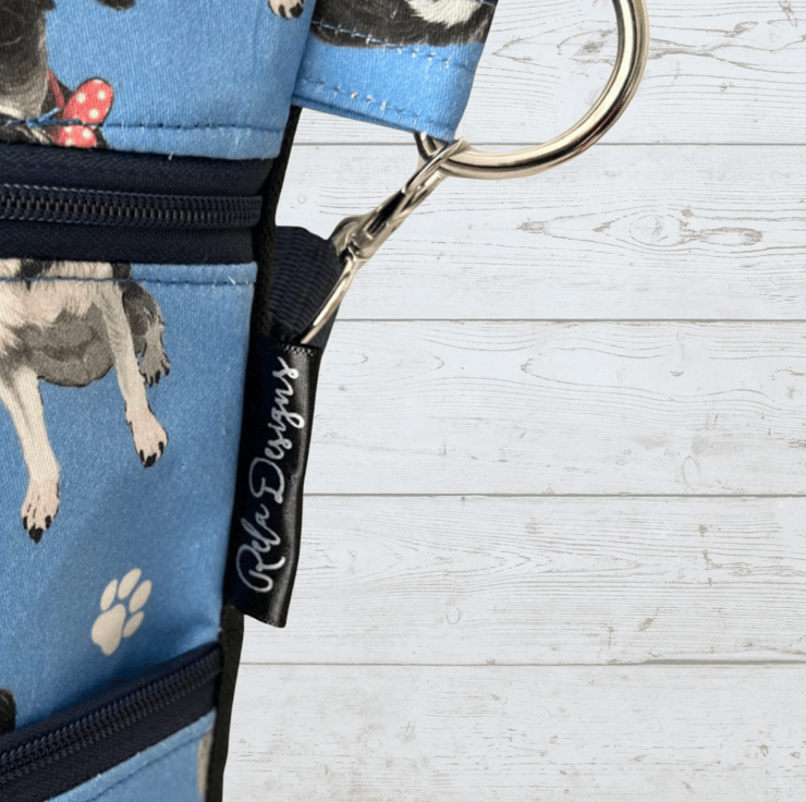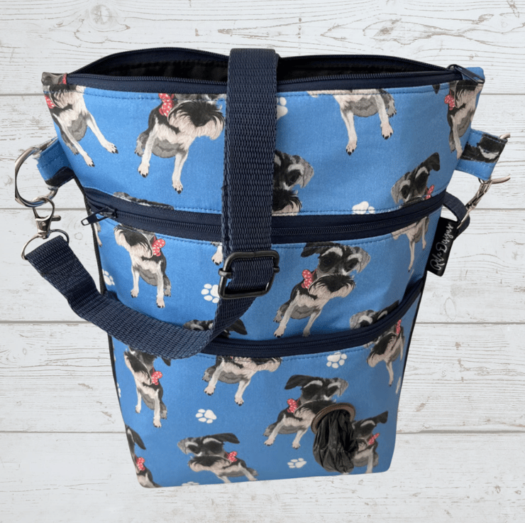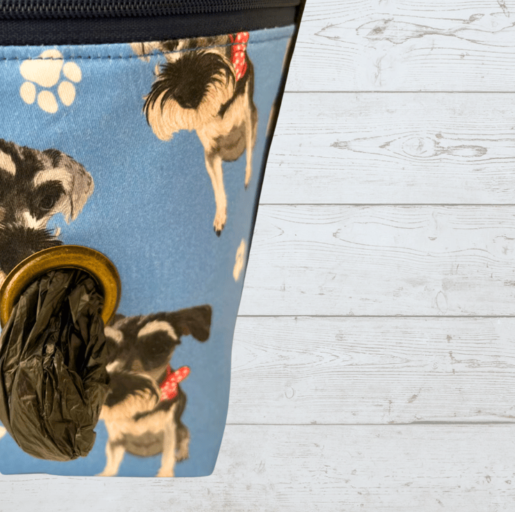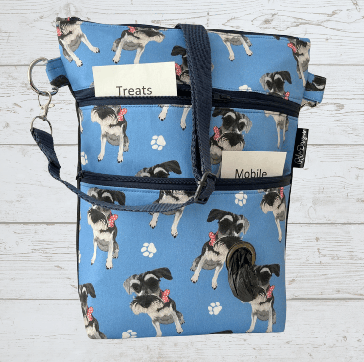 This schnauzer cotton print cross body dog walking bag has a plain black waterproof nylon canvas back and is lined with a black waterproof nylon lining. This handy bag will hold all your essentials for walking your dog.