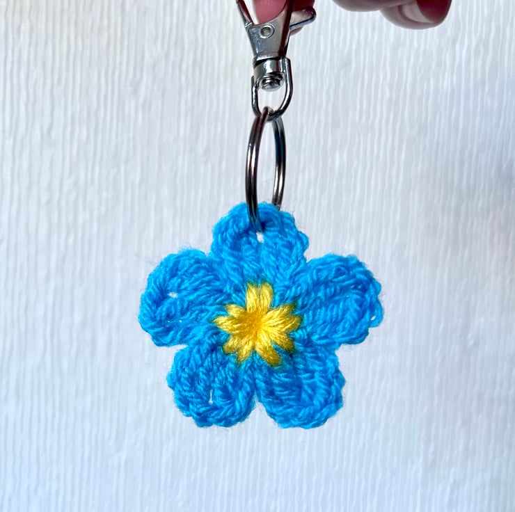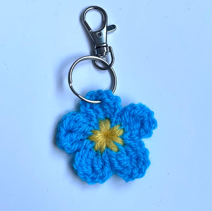 Crochet Forget me not blue and yellow keyring