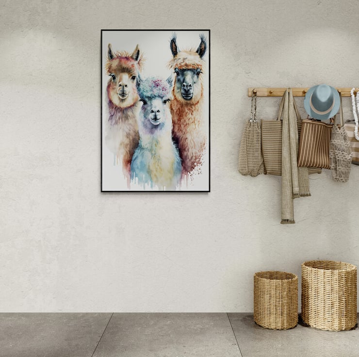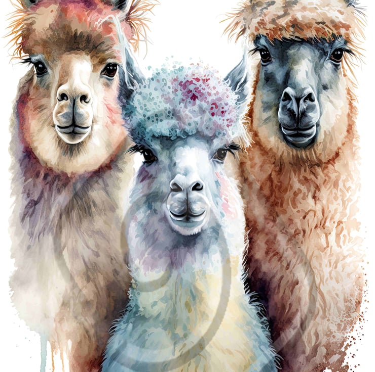 In this print I portray a group of three lively and playful llamas in a digital watercolour painting, set against a clean white background. Each llama is distinct in appearance and personality, with their unique quirks and expressions.