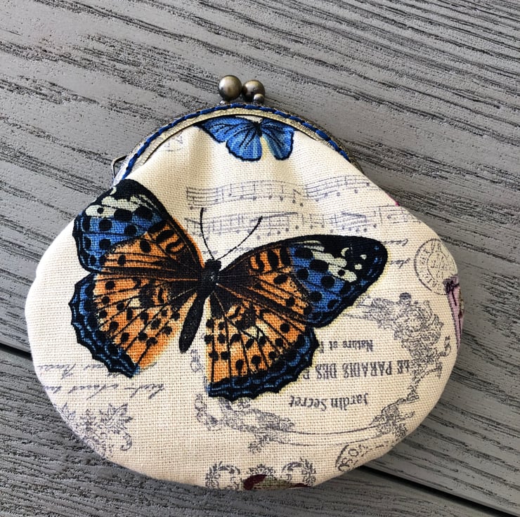 This delightful purse is made from a cream coloured hard wearing cotton with a music and butterfly design in shades of blue, black, orange, grey and pink.