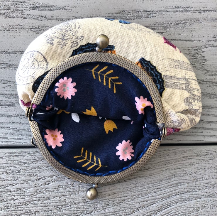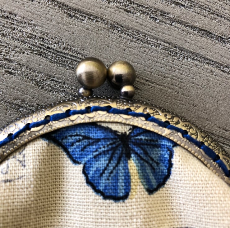 The antique bronze coloured embossed metal frame is sewn to the purse with a blue embroidery thread.