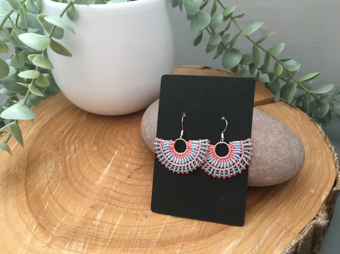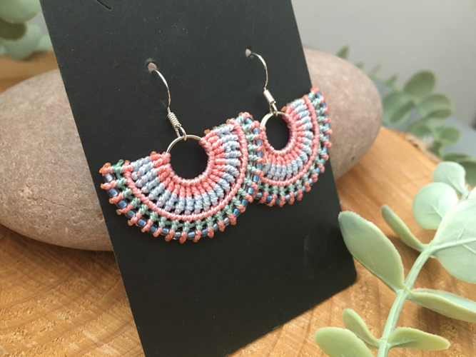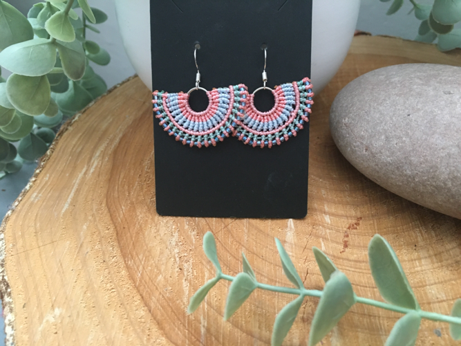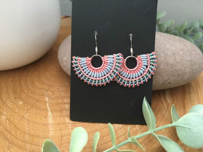 I have created these earrings using the intricate knotting art of macrame, using extremely strong C Lon thread in pretty sunshine colours of coral, pale blue and green. Tiny glass Miyuki seed beads have been threaded into the design to add a little bit of sparkle.