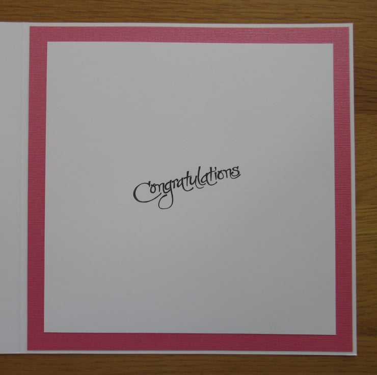 This lovely card in shades of pink features the pretty image of 2 swans facing each other, who have flowers for wings. I have placed the image on an angle upon a white embossed layer with a pink floral background card. I added a Wedding Day greeting which has been raised with 3D foam pads, as has the image and the inside has been finished to coordinate with a stamped Congratulations greeting.