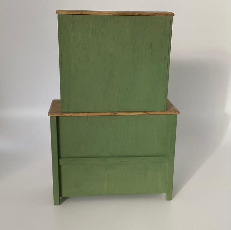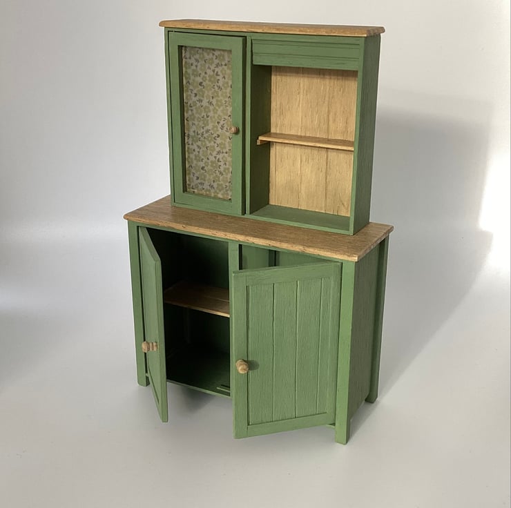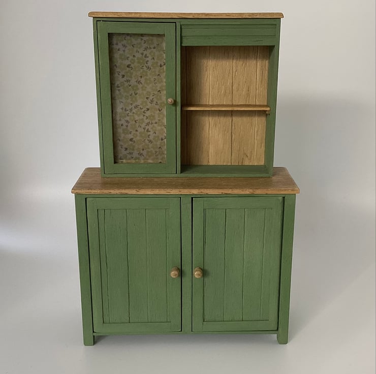 It is painted in Farrow & Ball Calke Green which is a beautiful, rich green. It is complimented by a French Oak varnish, it would look lovely in a cosy kitchen scene.