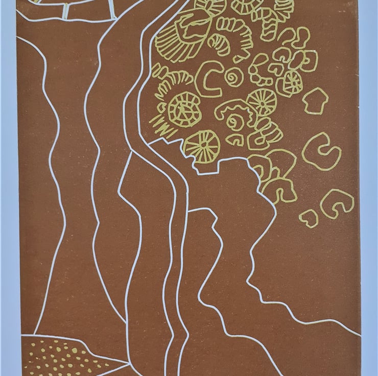 This is another print inspired by a visit to Stony Littleton longbarrow in Somerset. As well as an ammonite on the portal stone outside, there are many shapes of fossil shells on the passageway walls. These can be picked up in the light of a torch & traced with your fingers as you pick your way inside. It is very narrow & you have to stoop, so a bit of a squeeze getting in!