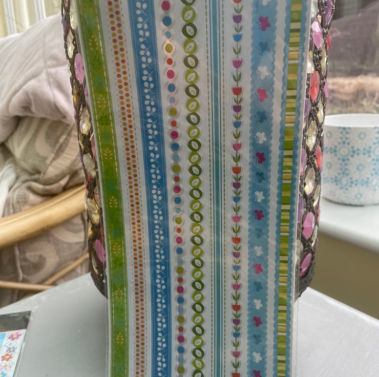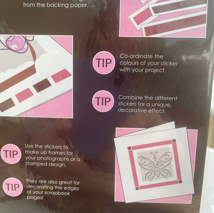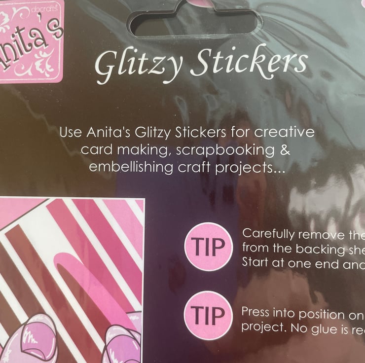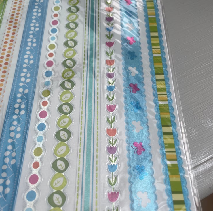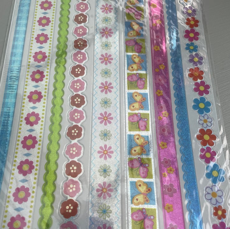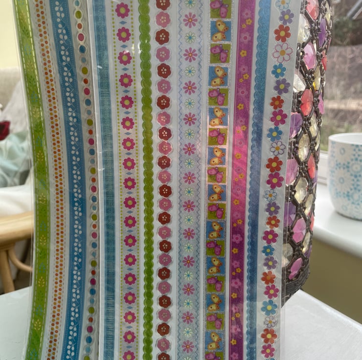 2 packets of 30cm Anita's Glitzy stickers. These packs each contain a different selection of 30cm strips of sticky paper ribbons. They are foiled and are lots of different colours including blue, green, orange, pink and yellow. The designs are quirky and have flowers, leaves dots, stripes and butterflies. Excellent for all kinds of crafting and would be great for children's crafting.