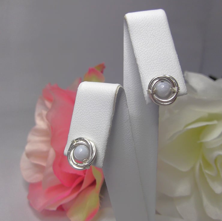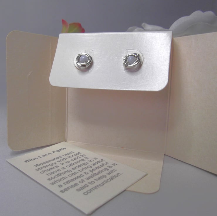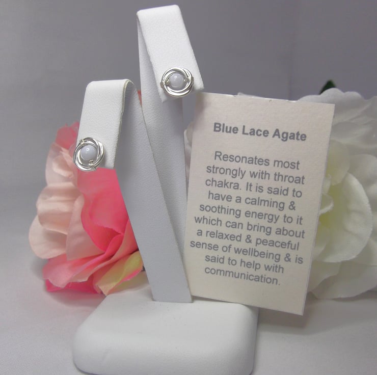 Hand crafted from recycled silver, these stud earrings feature a simple yet elegant Russian wedding ring design. At the centre of each earring is a beautiful soft baby blue, Blue Lace Agate gemstone bead.
