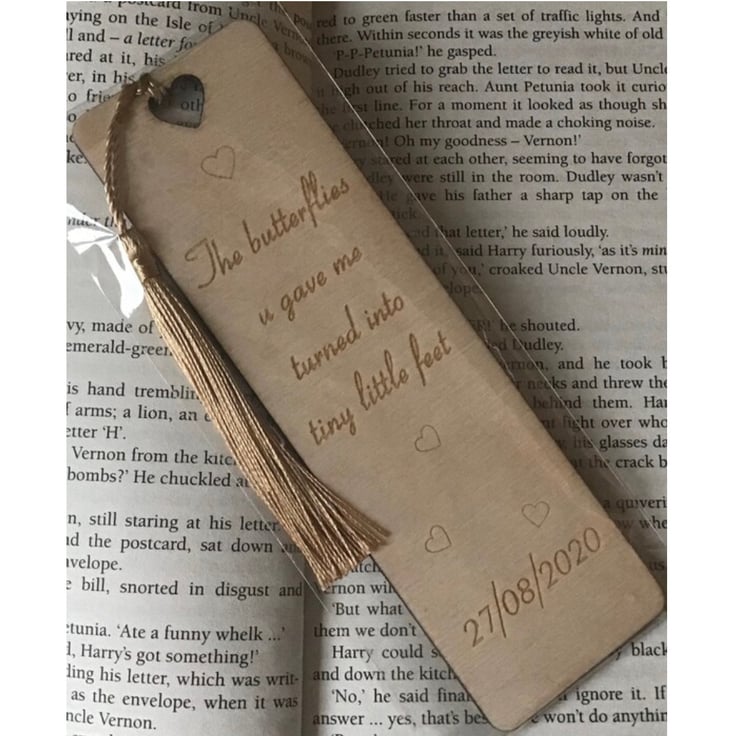 Lovely quality wooden bookmark, laser engraved and personalised with your choice of name/ phrase or quote, please contact me prior to ordering if you require a specific phrase to ensure the wording will fit, also if you require a specific illustration. Supplied with tassel, please specify your colour choice, if not a random colour will be supplied.