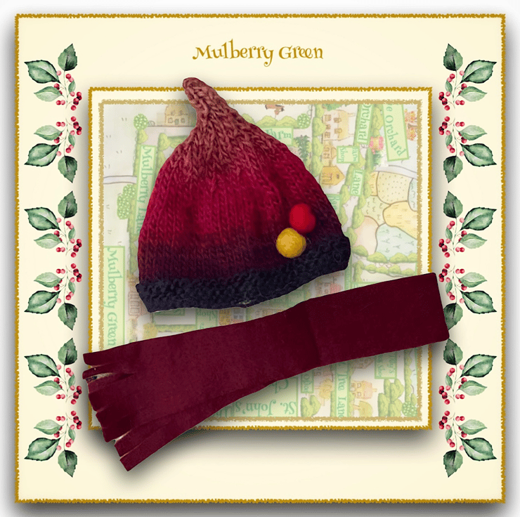 A lovely soft red shaded hat, decorated with little felt balls, to fit the Mulberry Green characters. The hat comes with a matching felt scarf..