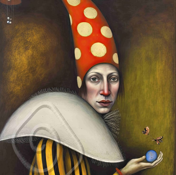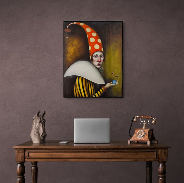 The background is kept minimal, with a hint of texture and a rich brown colour to add depth and interest to the painting. The lack of other visual elements creates a sense of isolation and detachment, which adds to the mysterious and otherworldly atmosphere of the piece.