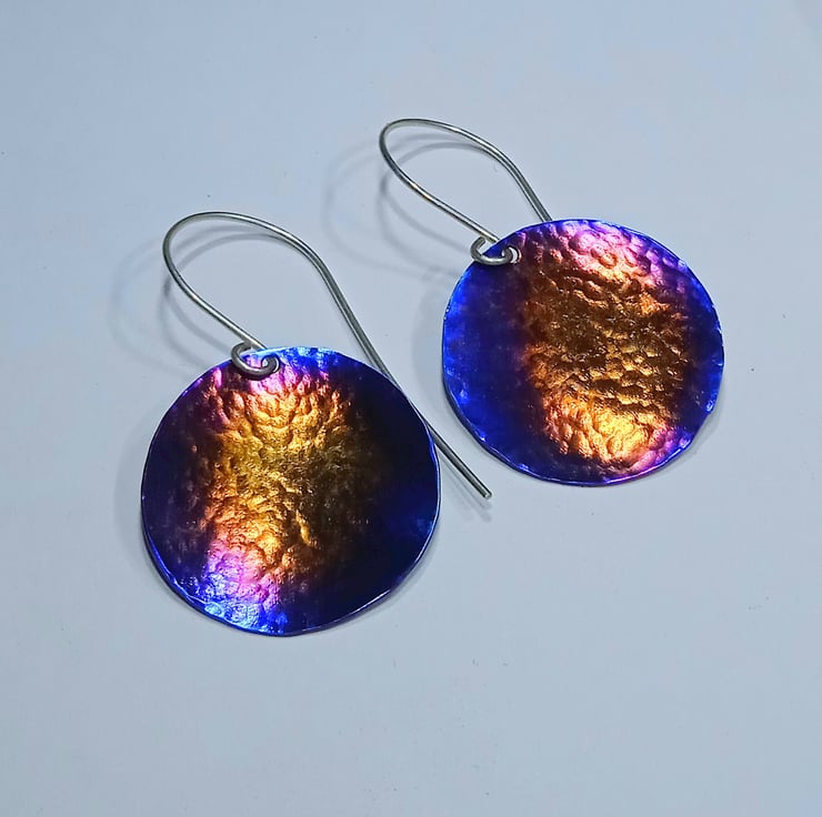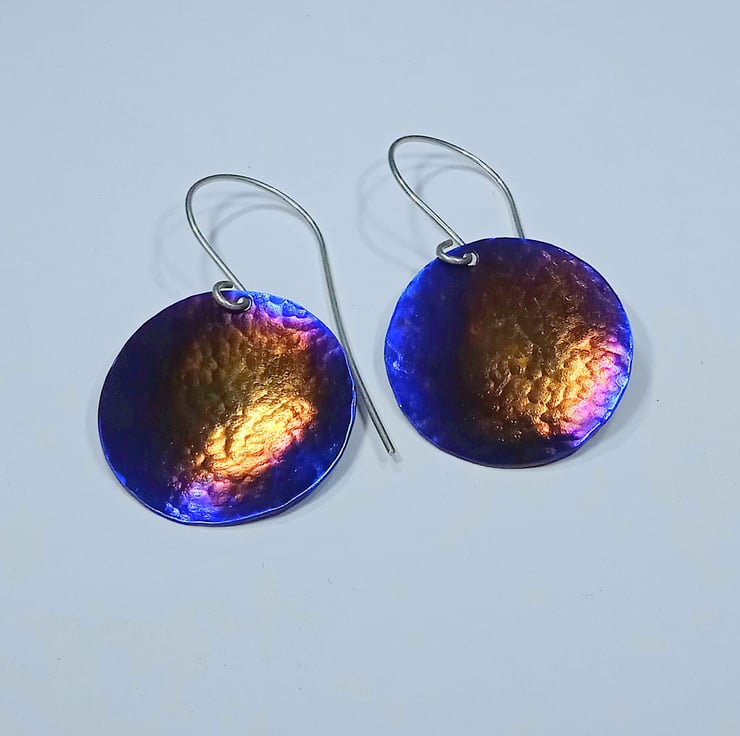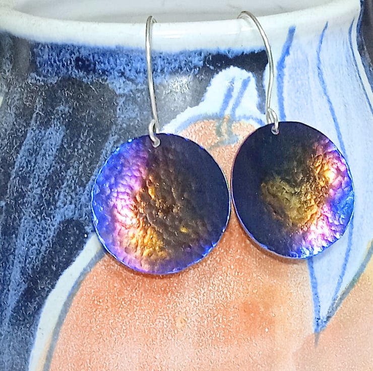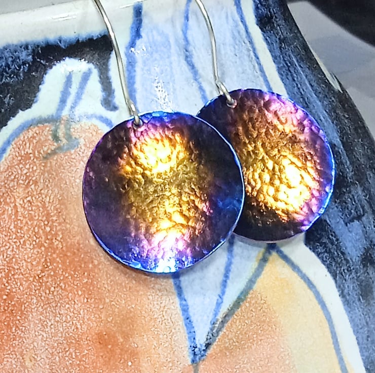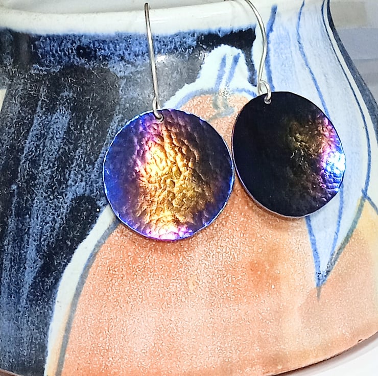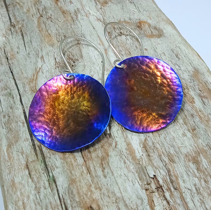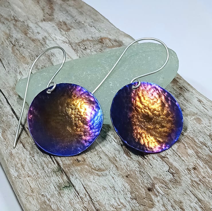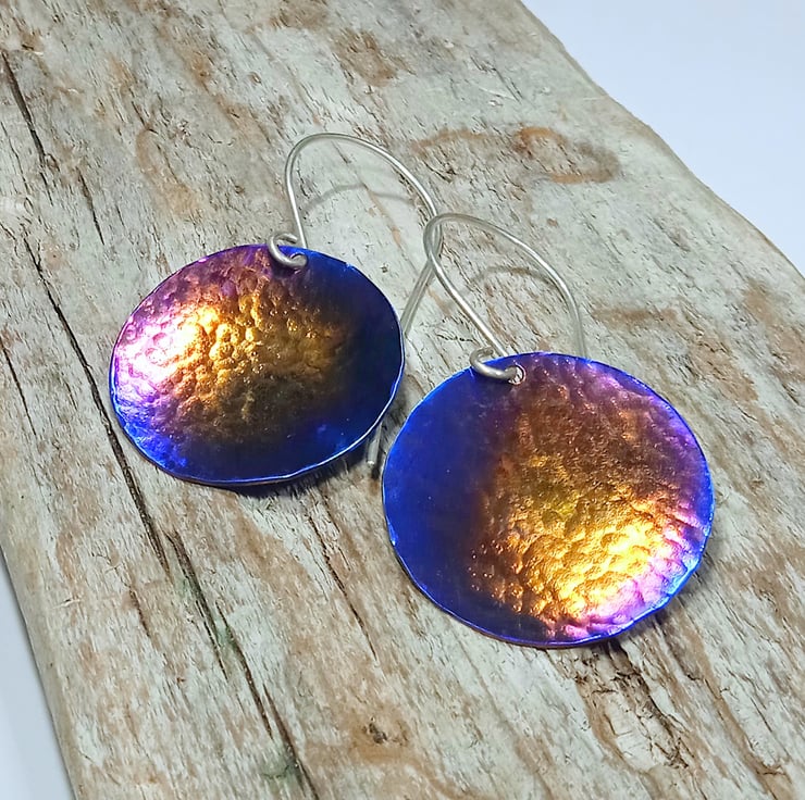 The titanium discs measure approximately 25 mm across and I have hung them from sterling silver earring wires which I have also hand made.