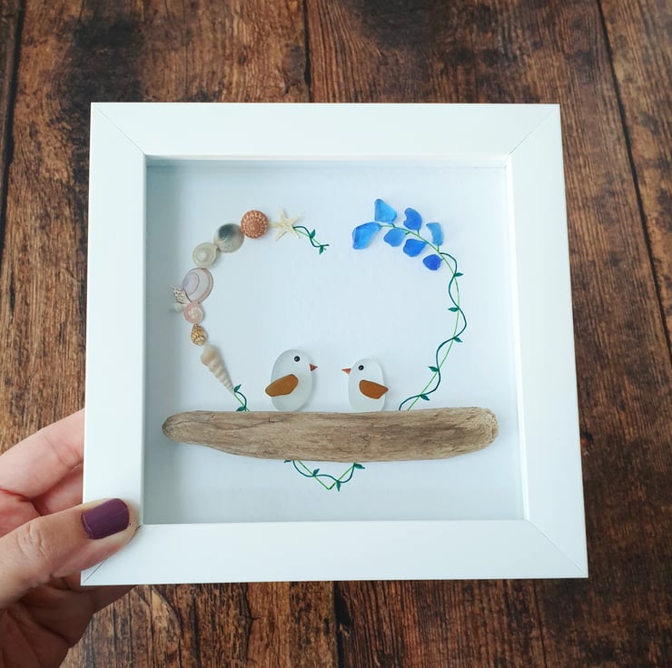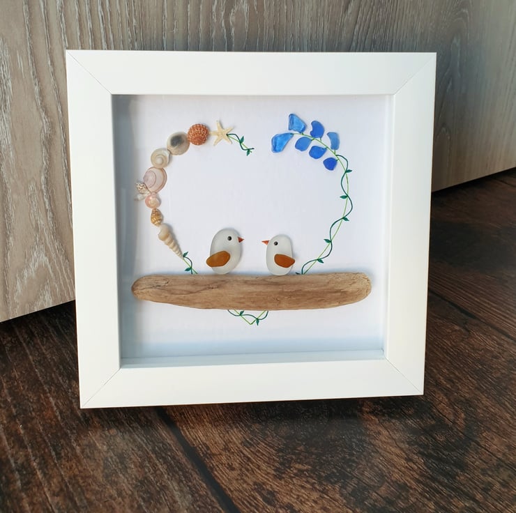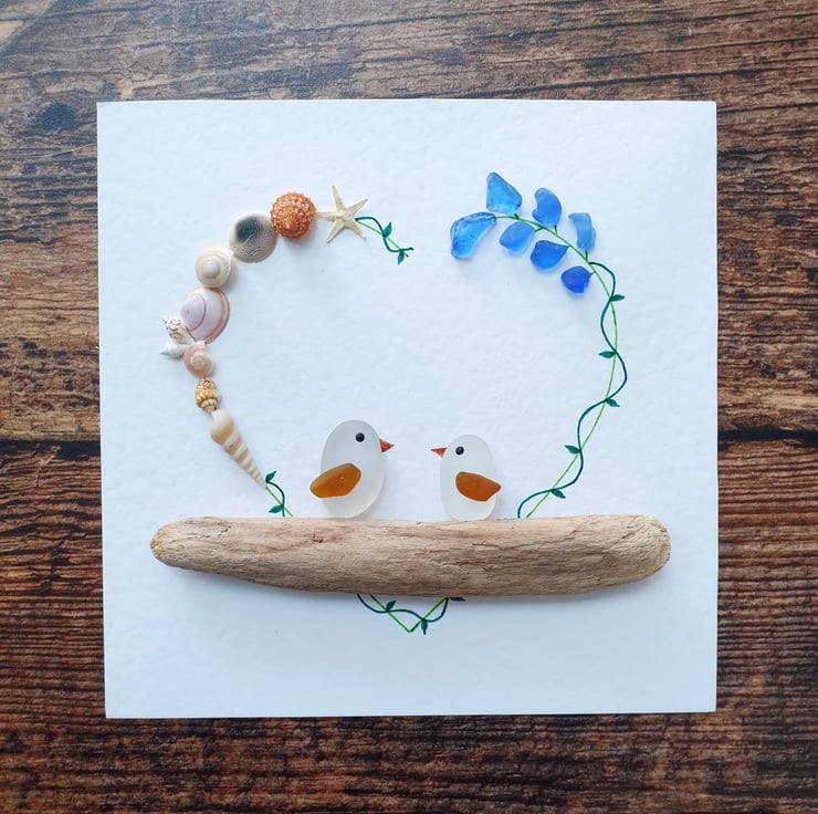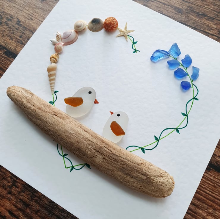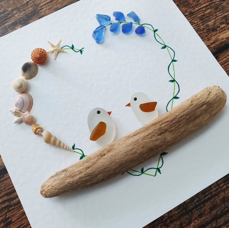 Beach inspired artwork with a touch of bohemian vibe of two lovebirds created with light blue sea glass, seashells and driftwood on recycled textured card.