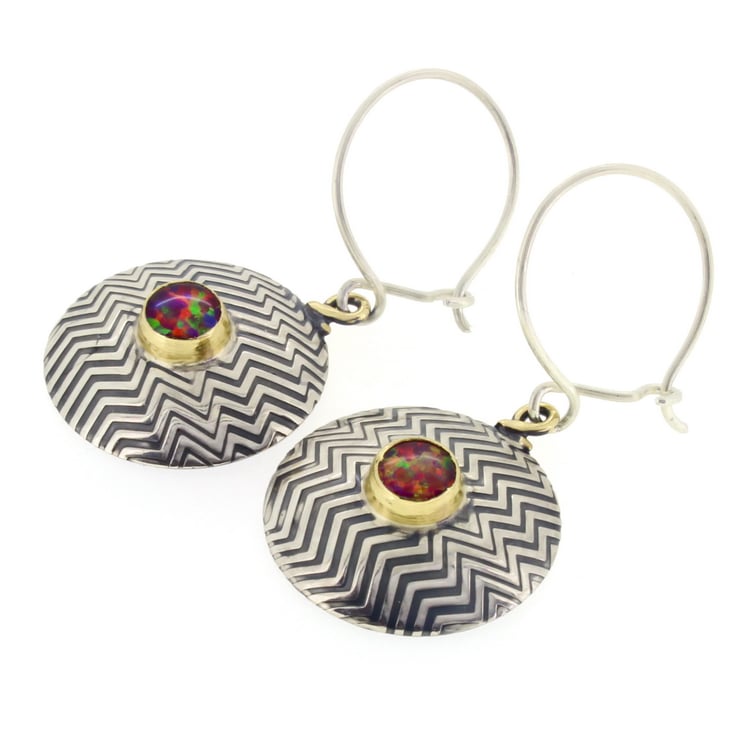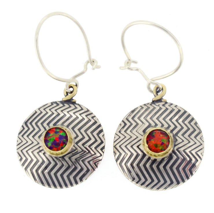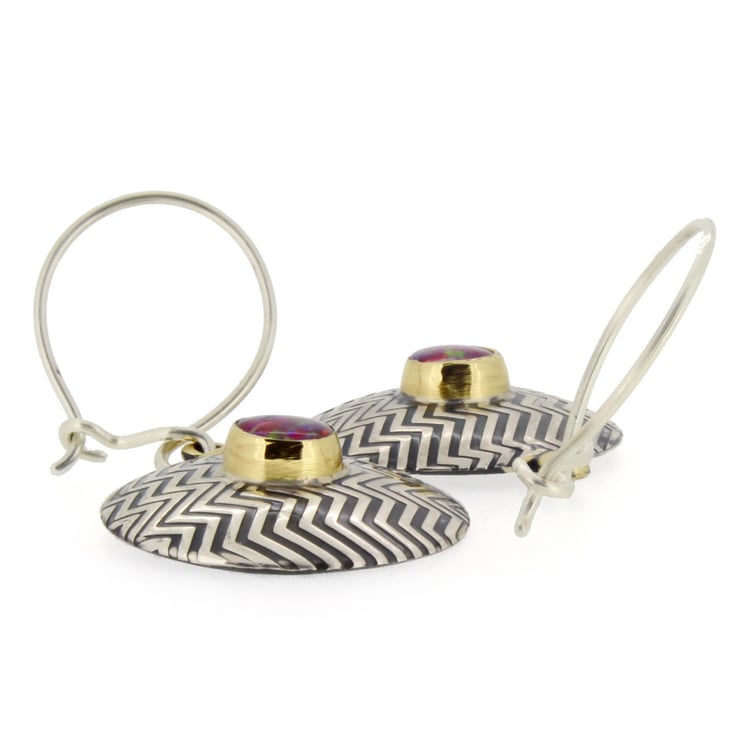 These Zigzag earrings are the larger of the two we make in our Zigzag jewellery range. They are handmade from sterling silver and feature two of our wonderful lab. grown red Opal triplet gemstones set in brass bezels. We have designed a pattern that has been deeply embossed into silver and the earrings have been oxidised and then polished to emphasise the Zigzag pattern. These earrings are slightly domed in shape, measure 25mm in diameter and are hung on sterling silver ear wires.