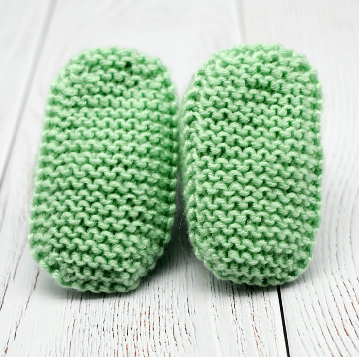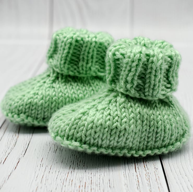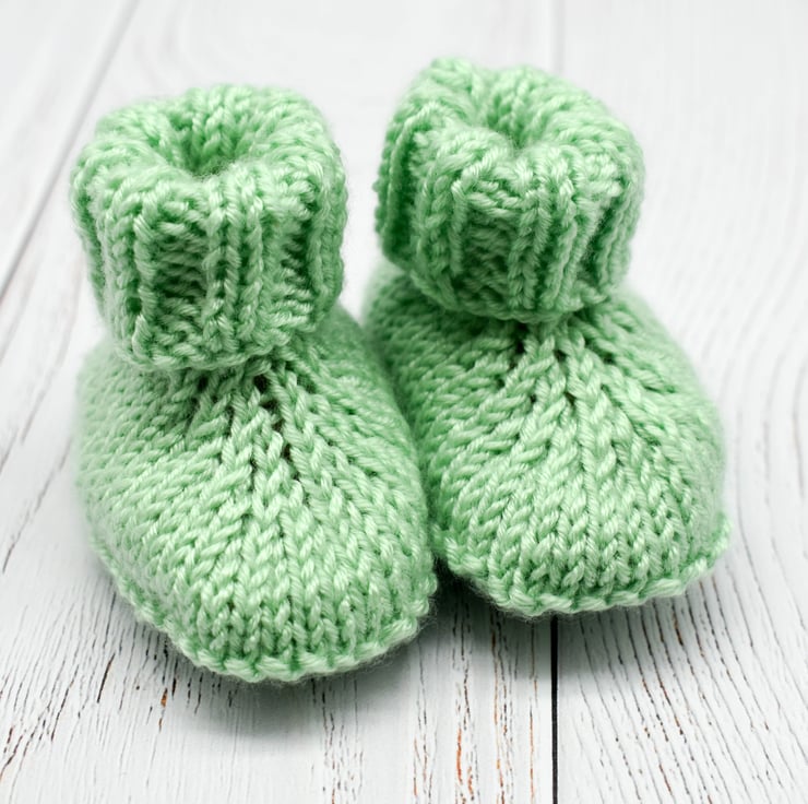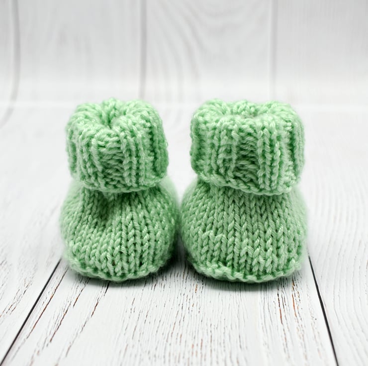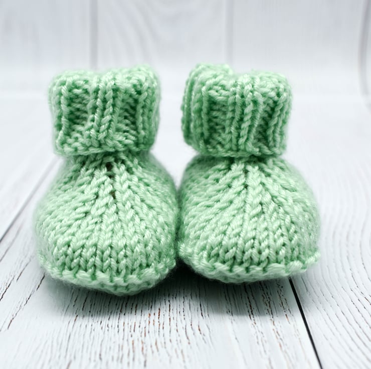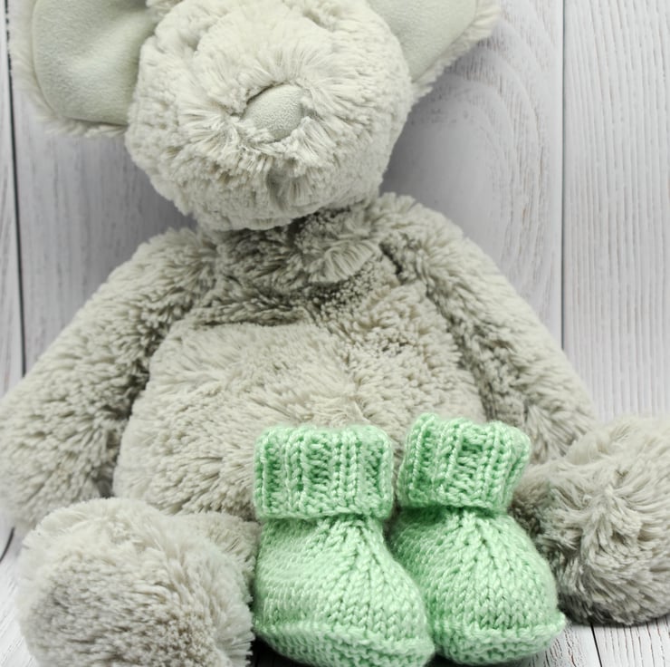 Hand knitted with luxuriously soft acrylic blend yarn, these booties will keep little feet lovely and cosy. They are kitted in mint green with ribbed cuffs which fold down and also help keep them in place.