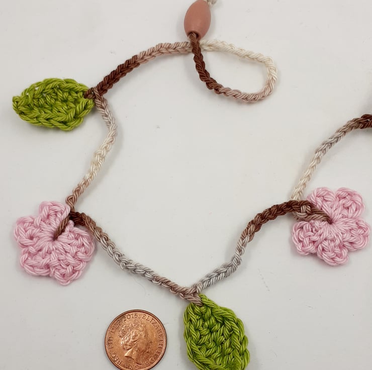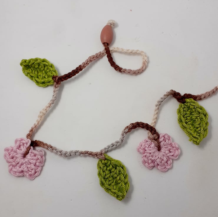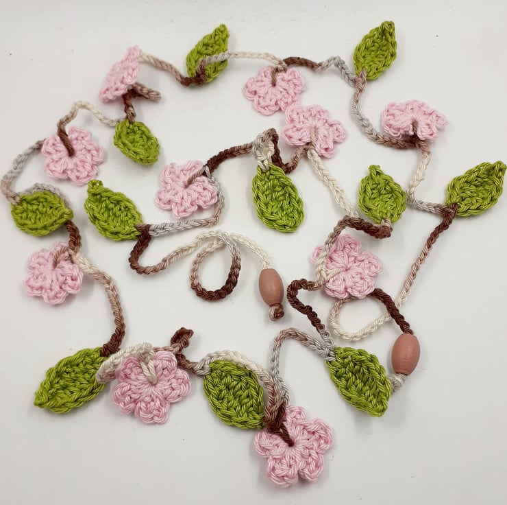 This pretty garland of small pink blossoms and bright green leaves, is crocheted in cotton and has a wooden bead at each end for easy tying. The 'string' is crocheted in a variegated brown/beige yarn for a subtle twiggy effect.