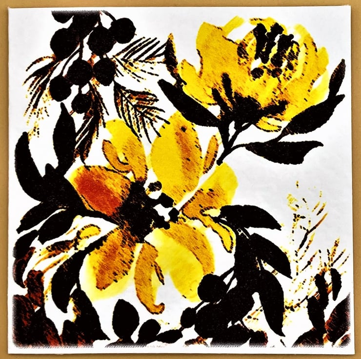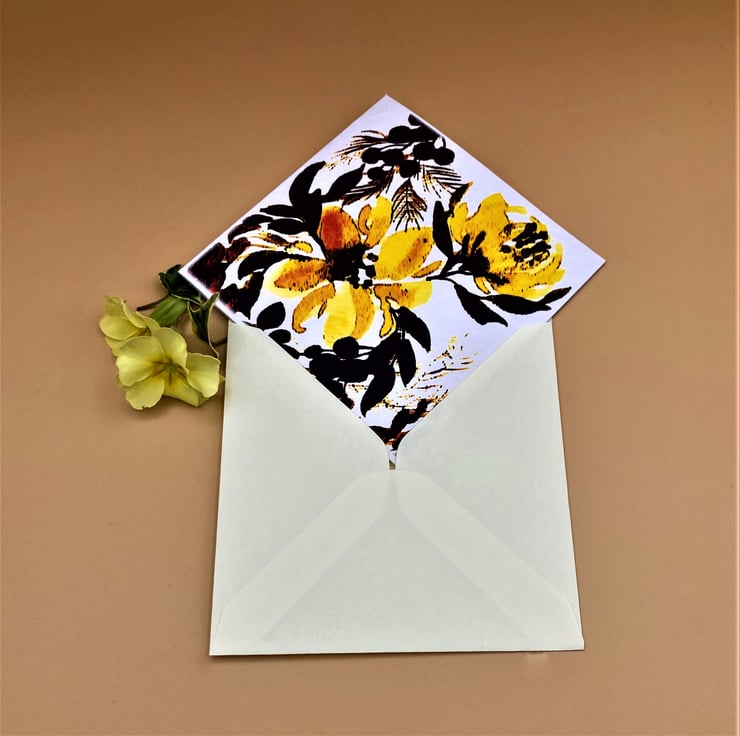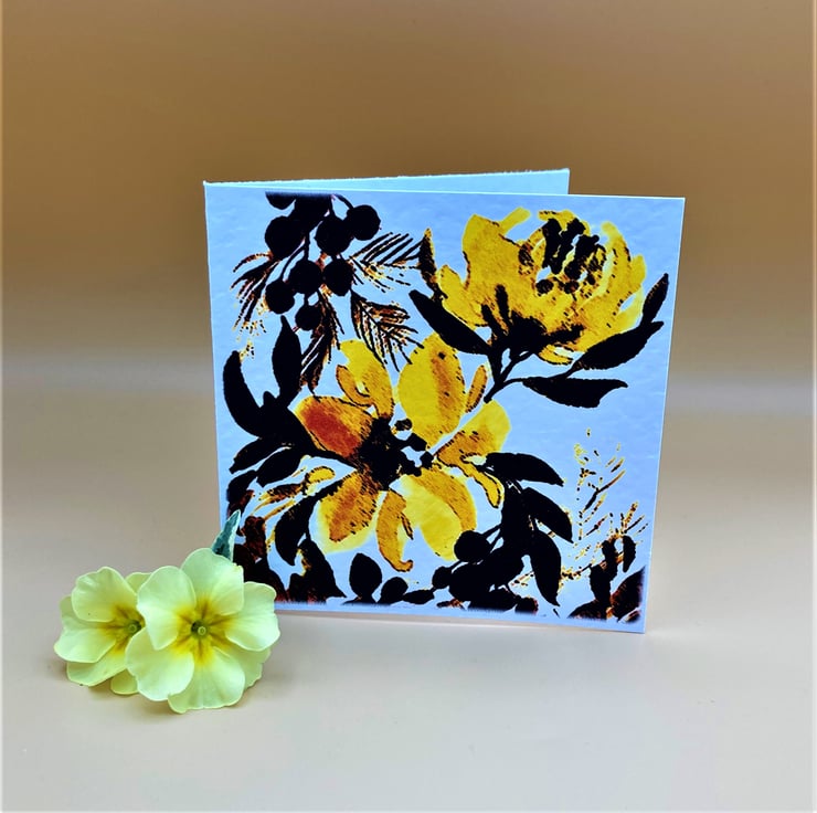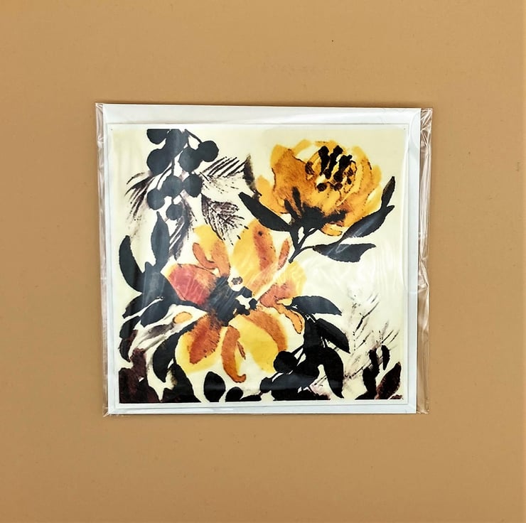 This card is an unusual colour combination with vibrant golden yellow flowers contrasting with the somber overtones of purple, brown and black leaves and berries. I think it could be used as one of those 'difficult to find cards' for awkward or sad situations. A handcrafted card can say so much and you can never go wrong with flowers as a subject. I really enjoy painting flowers and playing around with subsequent prints, which I then use to make unusual and original cards. I like to think that someone might also keep one of my cards as a comforting reminder of support received during a difficult time.