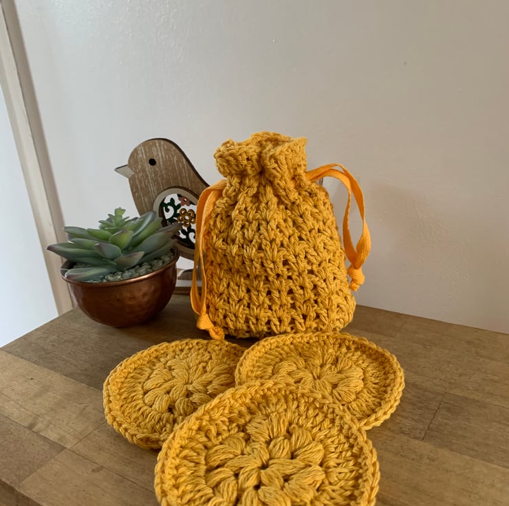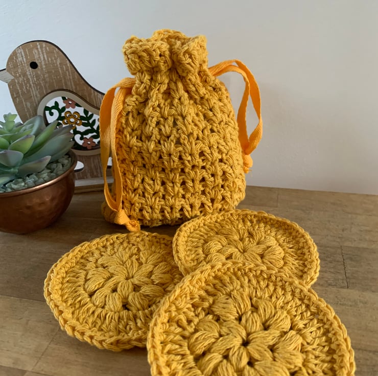 Set of 3 reusable crocheted face scrubbies together with a matching drawstring crocheted bag. This set makes a perfect gift for teens or adults. They can be thrown in the wash with your laundry and reused multiple times.