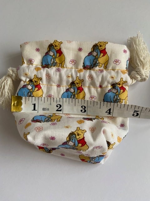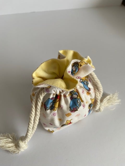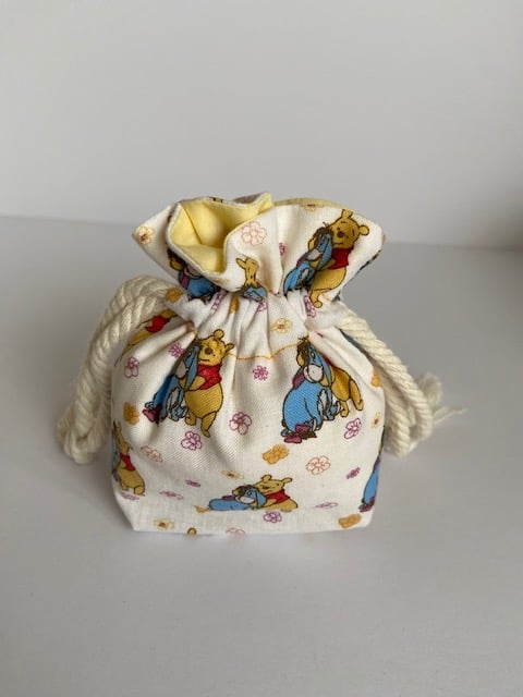 Handmade Winnie The Poo Drawstring Bag, made with 100% cotton and is fully lined in cream. Finished off with a 5mm natural cord.it measures roughly 5 inches wide and 5 inches high. This bag could be ideal for storing dummies, tissues, or anything small that you don't want to loose.