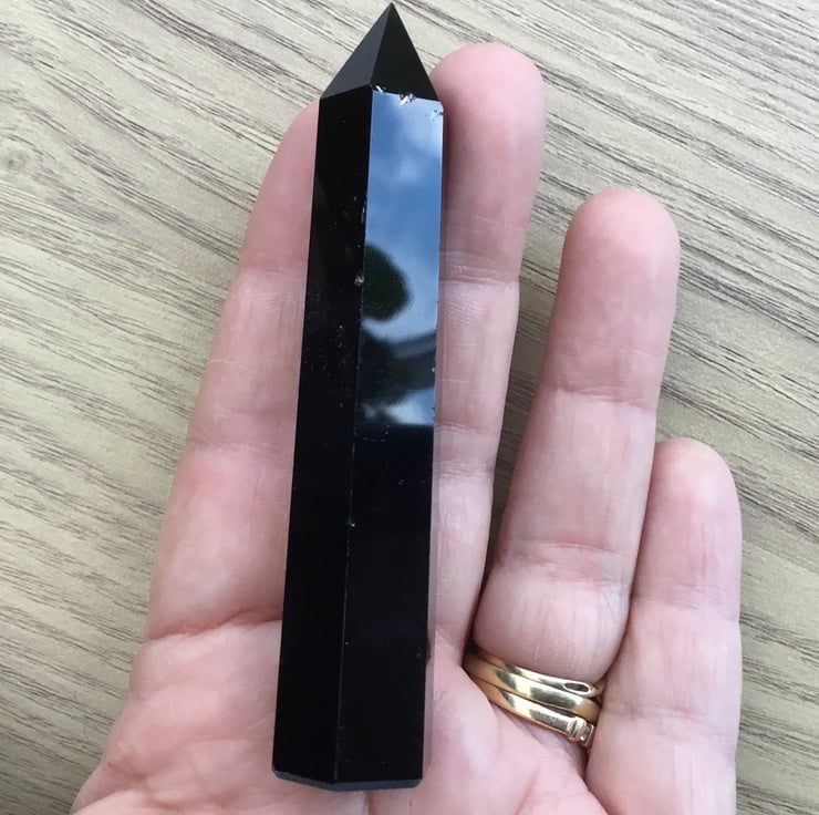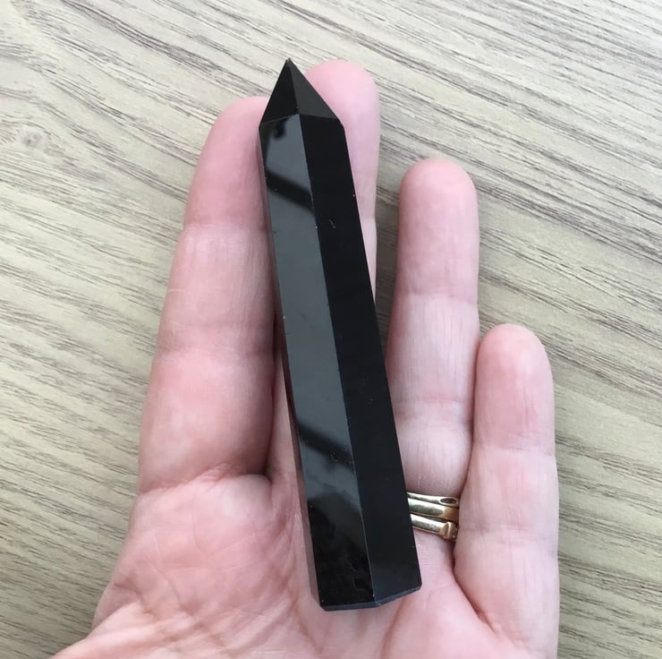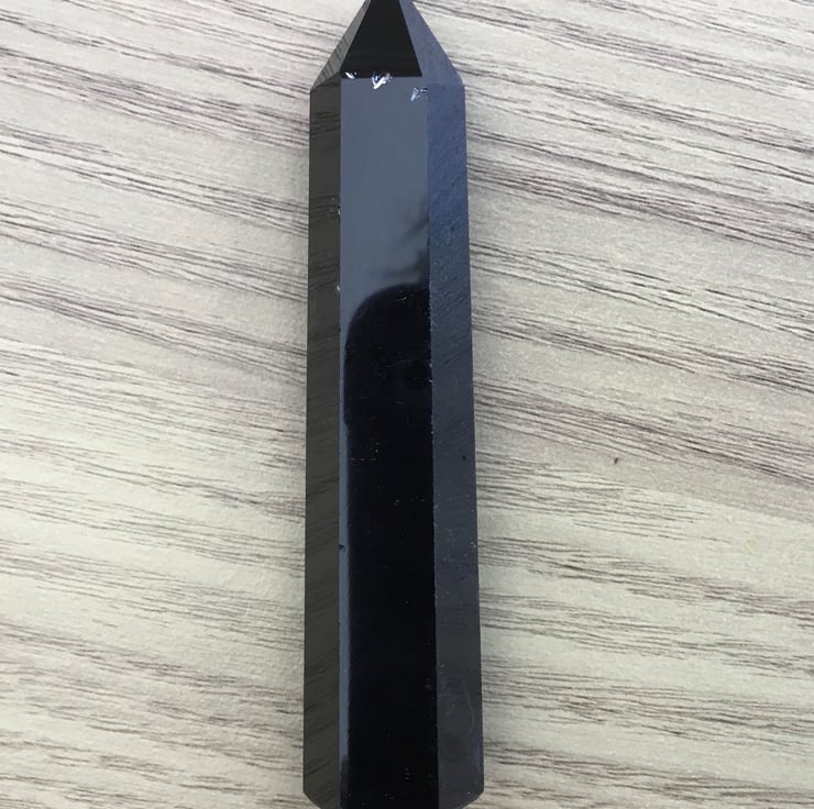 This slim hexagonal obsidian point can stand on its base and with the flat sides that catch the light is a wonderful home decoration.