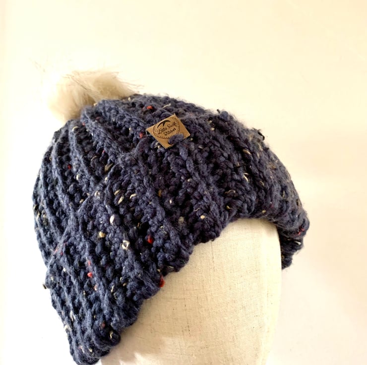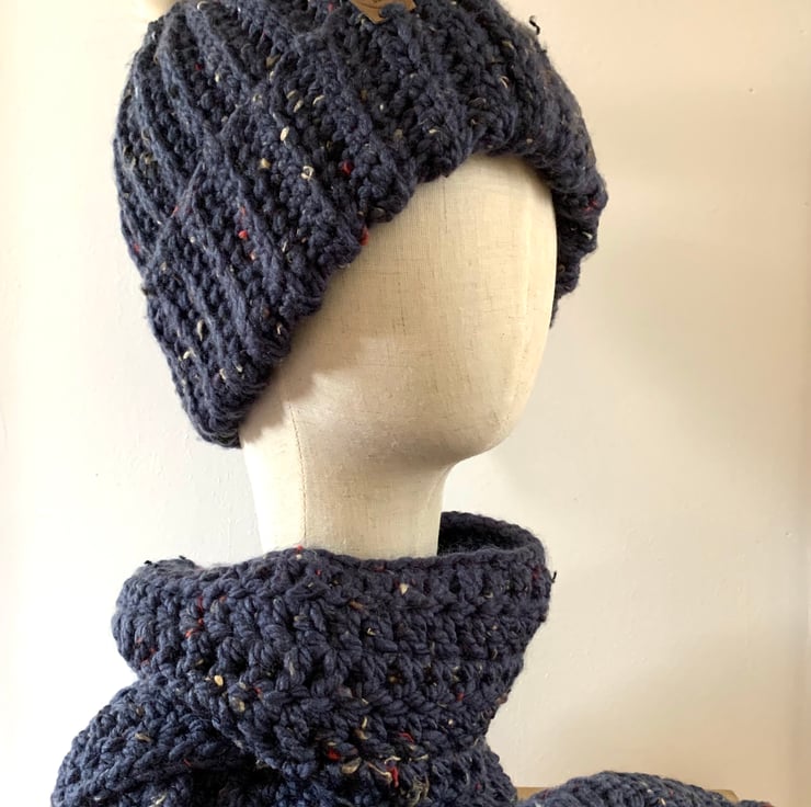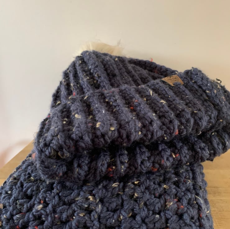 Crocheted chunky hat and scarf set. Made with premium denim blue acrylic yarn with multicoloured flecks. The hat is complete with a removable faux fur cream Pom Pom. The long scarf has matching tassels and drapes beautifully. The set is chunky and warm and would make a perfect gift for Mother’s Day, birthdays or a treat for yourself.