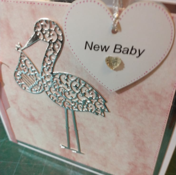 A completely handmade and uniquely designed card. Consisting of a stork die cut from silver mirror card mounted onto pink mottled card then onto silver mirror then onto pristine white quality card. A heart tag with new baby and heart. Finished off with pink ribbon and bow