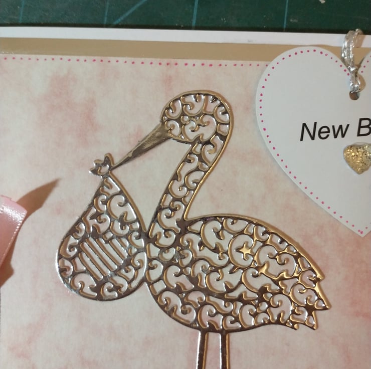 A completely handmade and uniquely designed card. Consisting of a stork die cut from silver mirror card mounted onto pink mottled card then onto silver mirror then onto pristine white quality card. A heart tag with new baby and heart. Finished off with pink ribbon and bow