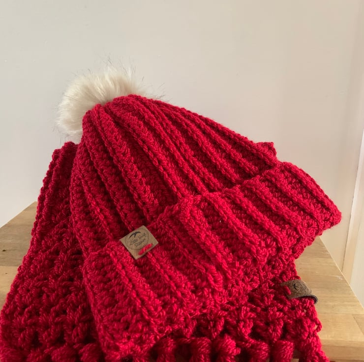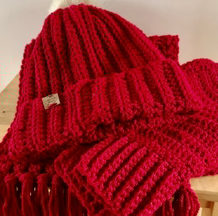 This beautiful bright and cheerful set is crocheted using premium acrylic red yarn. The hat comes complete with removable faux fur Pom Pom and a cosy cuff to keep ears warm. The scarf is long and drapes beautifully and has matching tassels keeping your neck warm even on the coldest days. The mittens are cosy with a deep cuff to keep them in place and wrists warm. This matching set would make a perfect gift for birthdays, Mother’s Day or a treat for yourself.