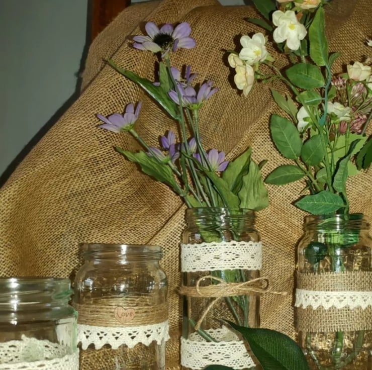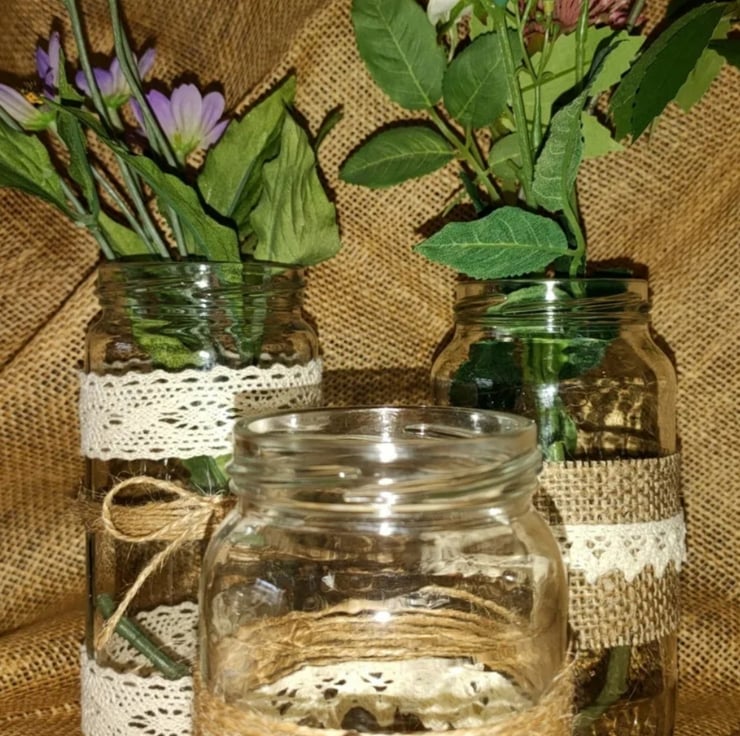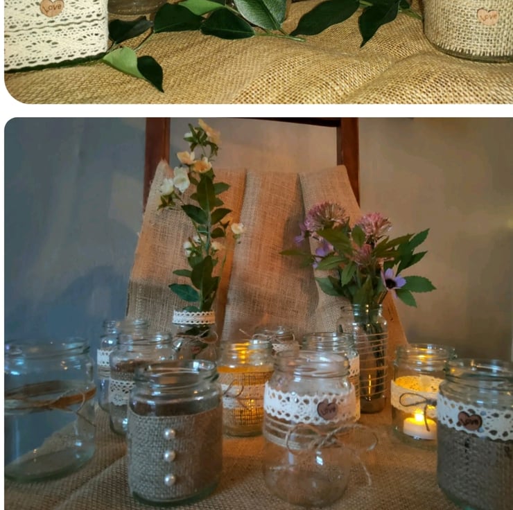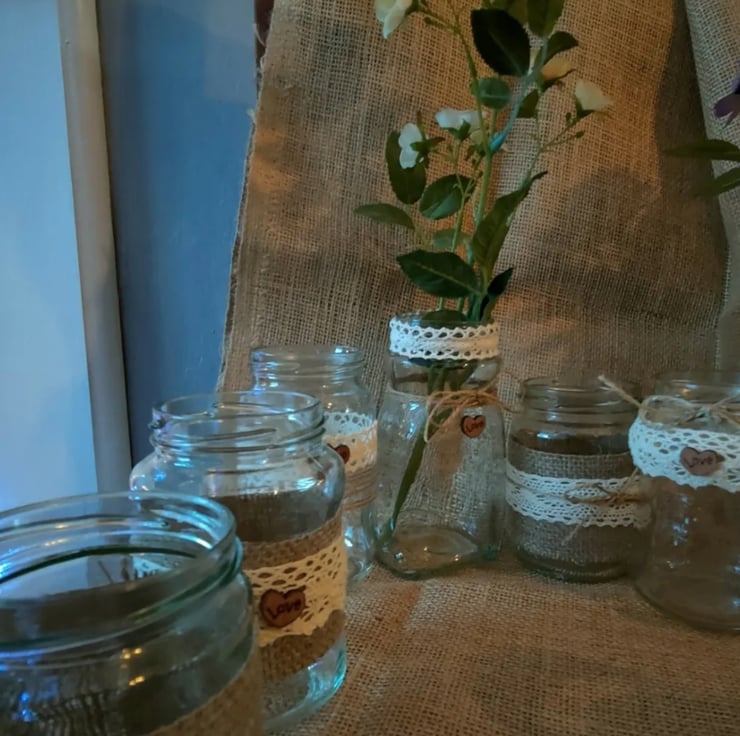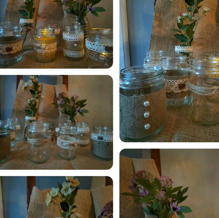 This is a set of 12 upcycled random shaped and sized jars all uniquely decorated in a rustic vintage style with Hessian lace pearls ivory fabric jute string and pearls .