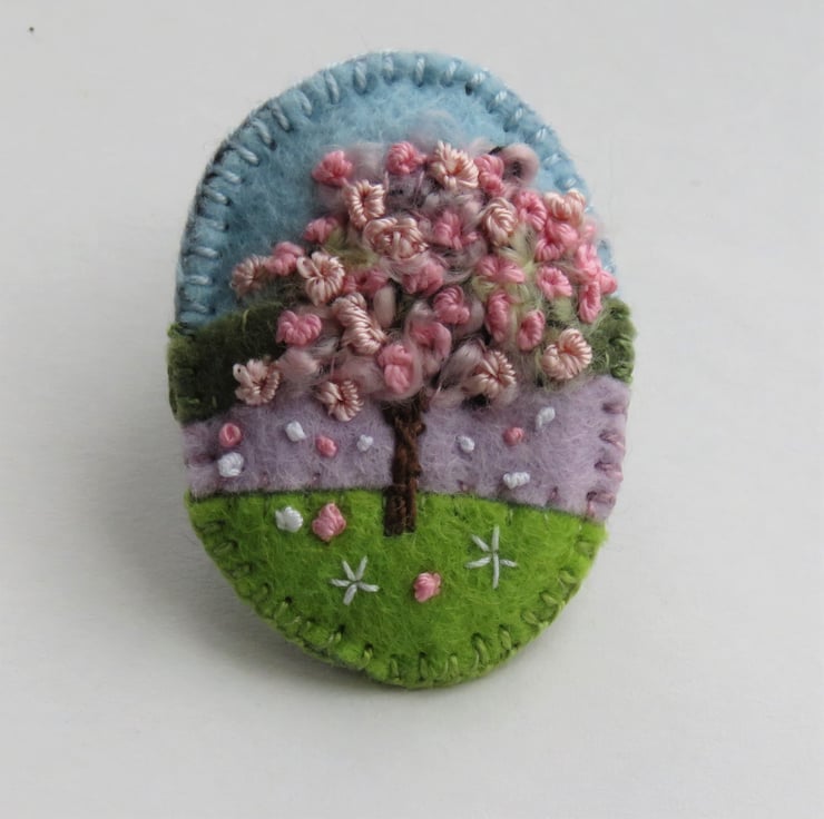 A hand embroidered felt spring brooch featuring lovely cherry blossom.