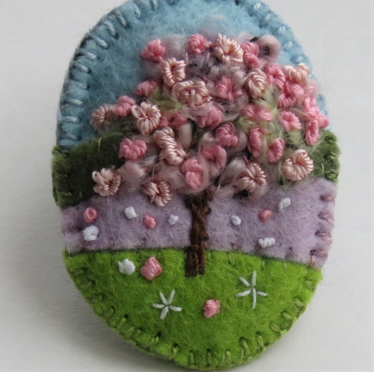 The background of the brooch has been created from felt. The tree has been stitched in cotton threads using simple embroidery stitches. The blossom has been stitched by couching over a fancy yarn in shades of pink and pale green enhanced by french knots in two shades of pink thread - one of which is a vintage thread with a lovely sheen.