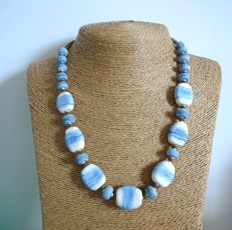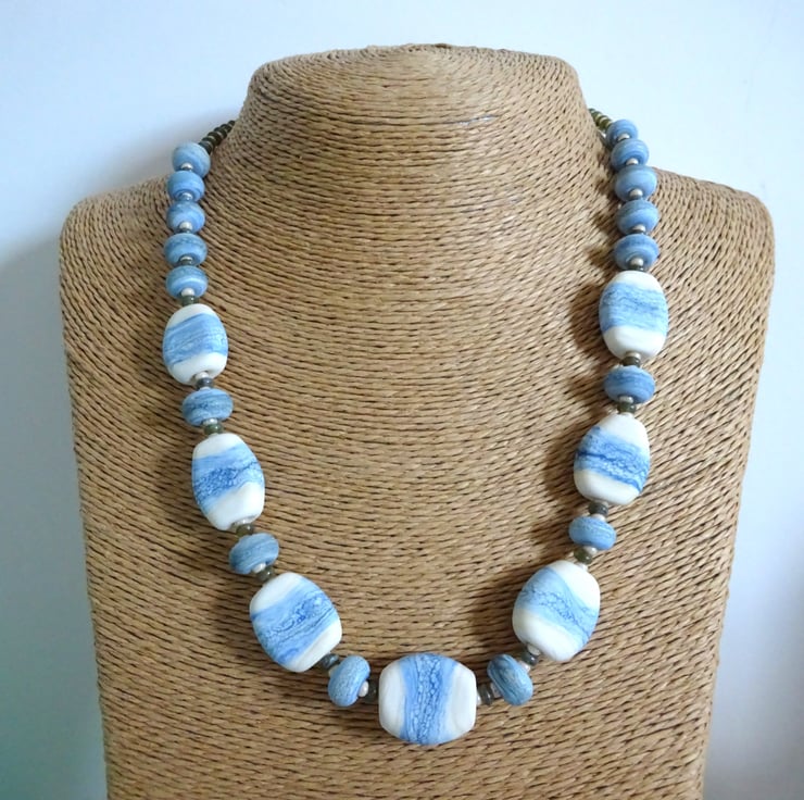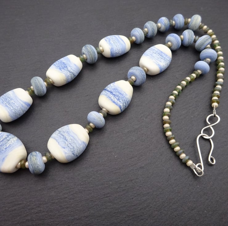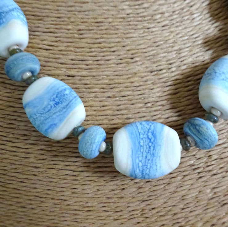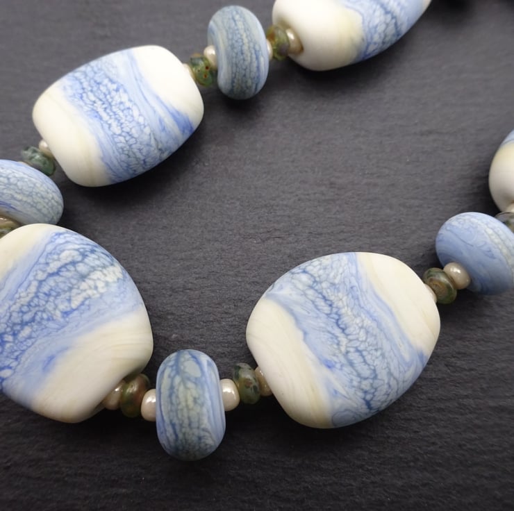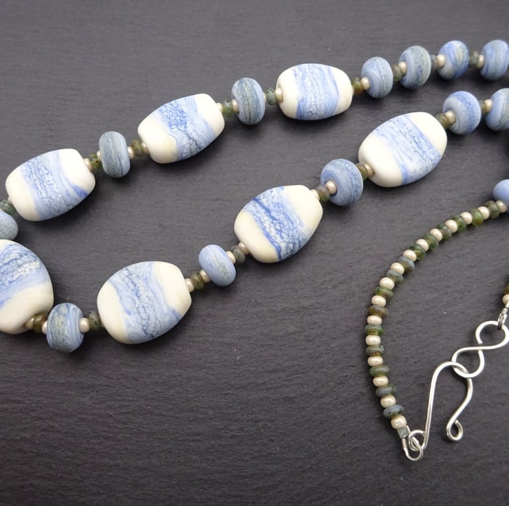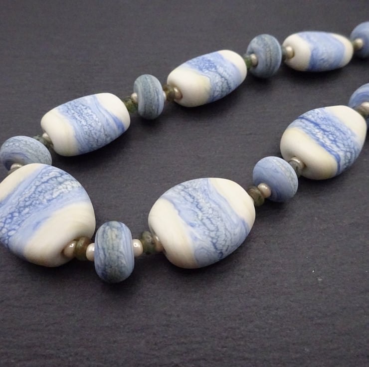 The beads have been handmade by me using ivory and blue glass, the beads have been tumbled to give a smooth finish.