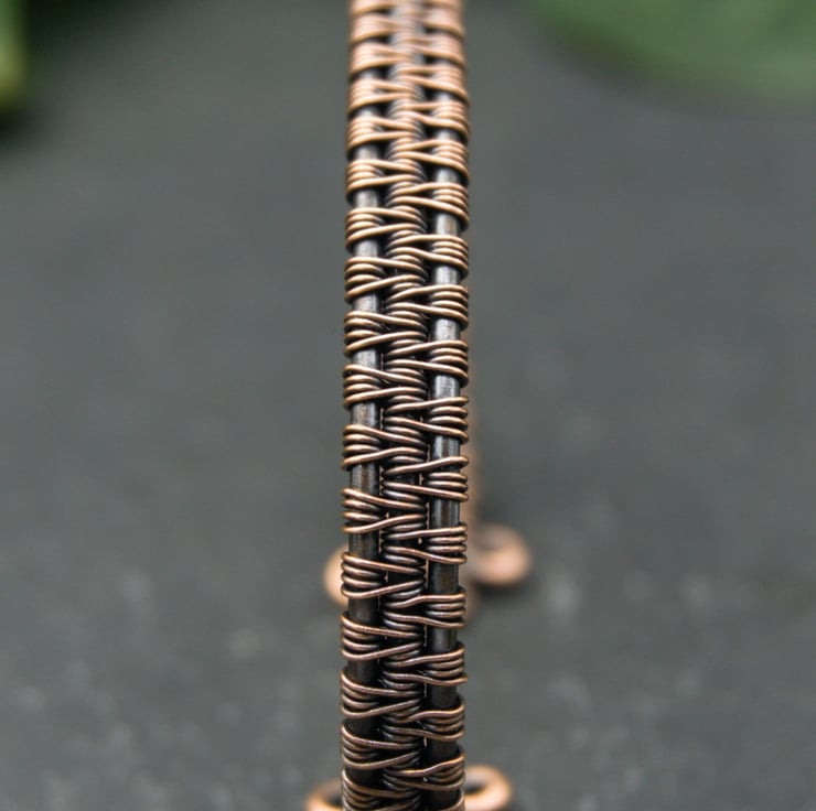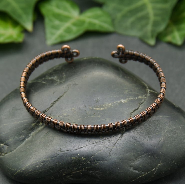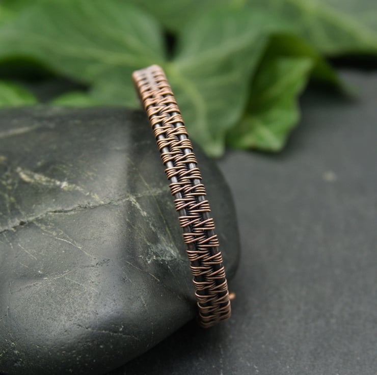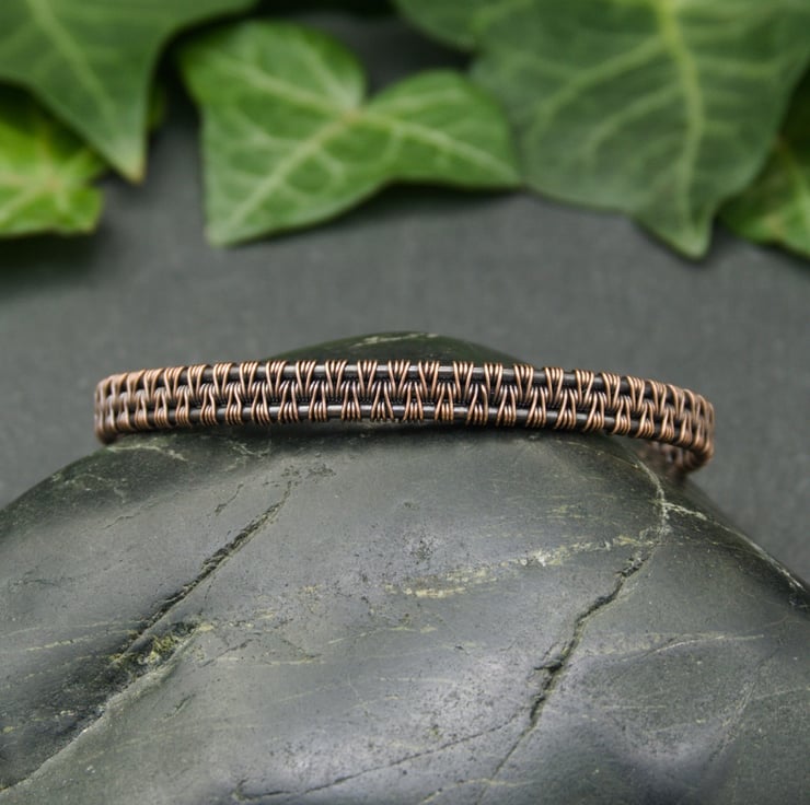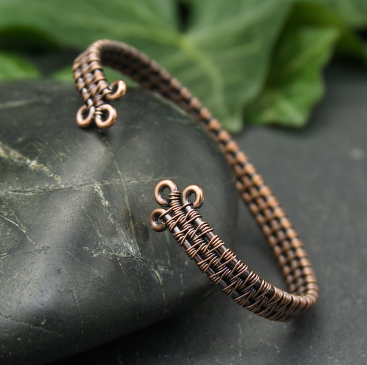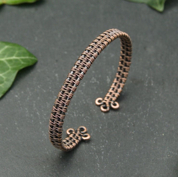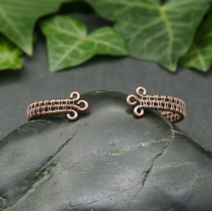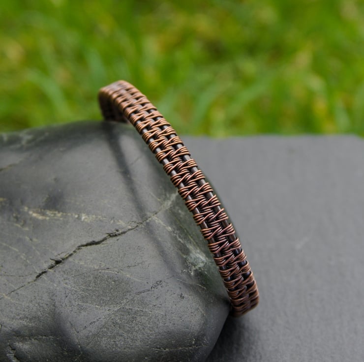 This lovely cuff has been handcrafted from three lengths of thick copper wire, woven together with very fine wire in a chequered pattern. The ends of the cuff have been finished with small closed loops - adding a pretty detail, whilst making it comfortable to put on and wear. It looks simple at first glance, but with a closer look you can see the beautiful detail in the wire weaving. This cuff is perfect for someone who likes their jewellery understated, but still interesting!