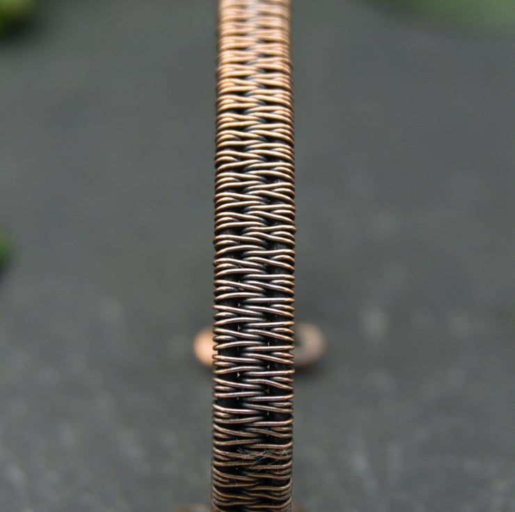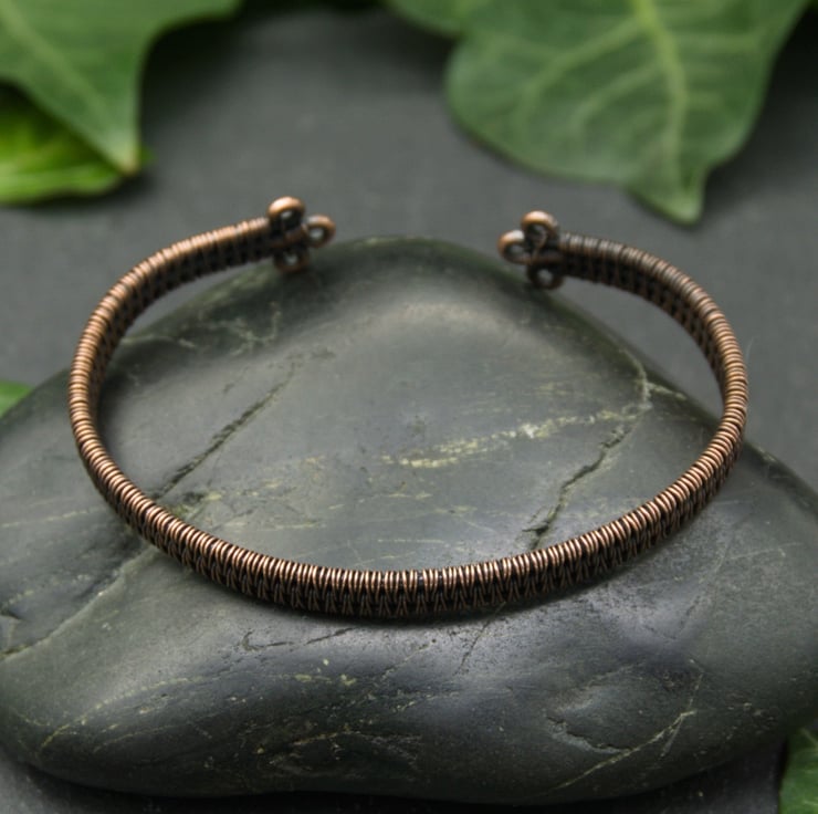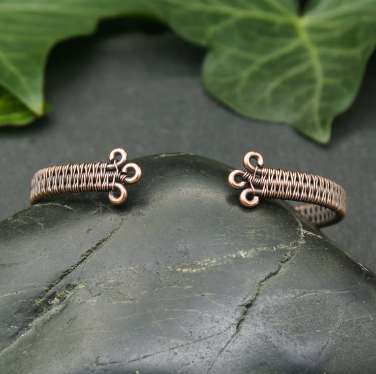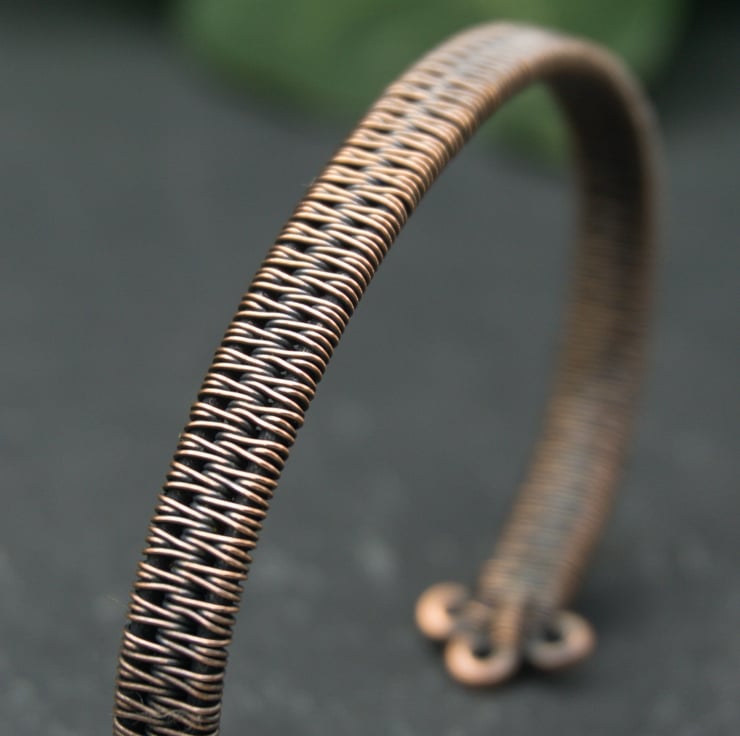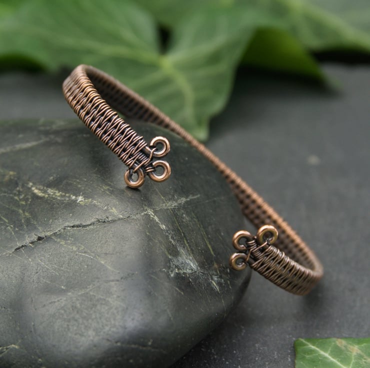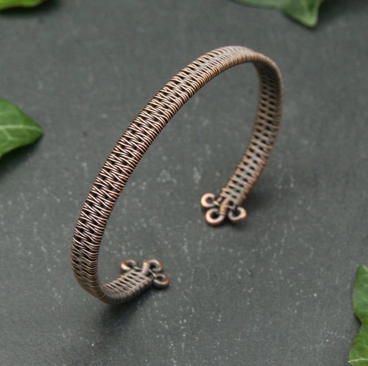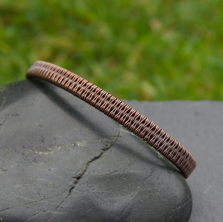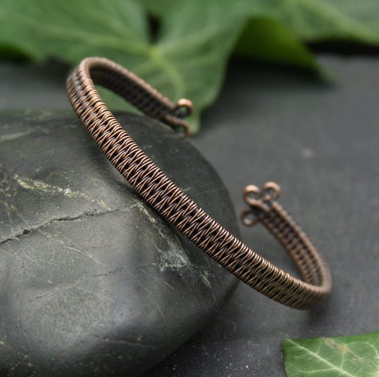 This slim copper cuff has been completely handmade by weaving together three lengths of thick copper wire into a solid band. I’ve finished the cuff with small closed loops, so that it is comfortable to put on and wear. This cuff appears simple, but with a closer look you can see the intricate detail of the wire weaving - perfect for someone who likes their jewellery understated, but still interesting!