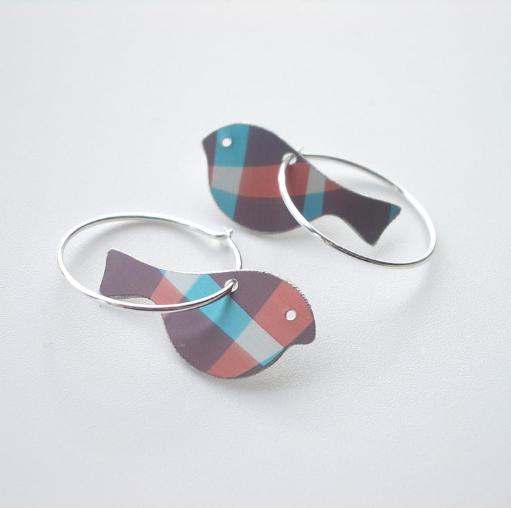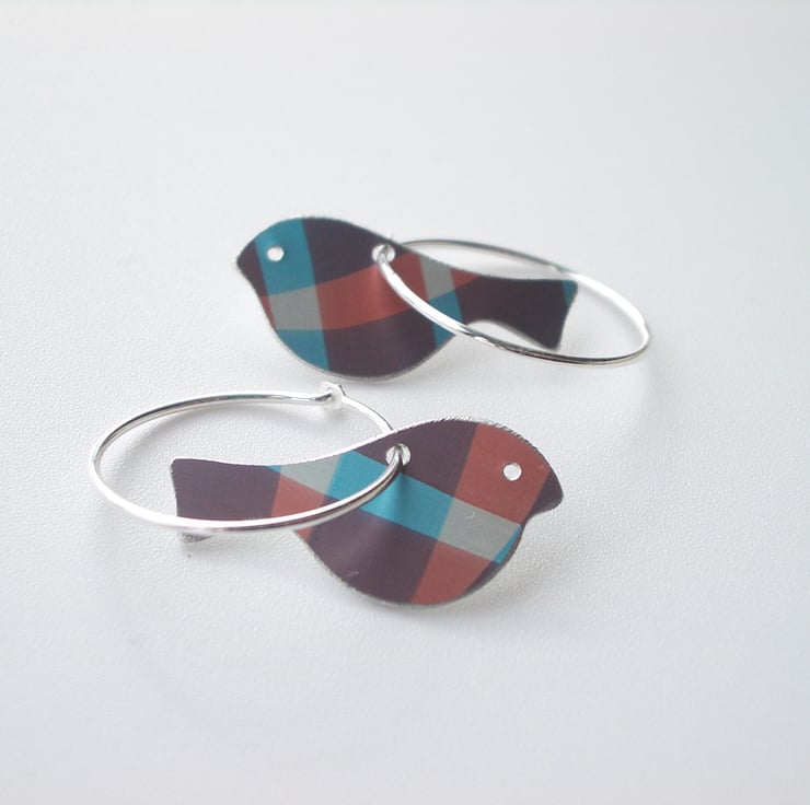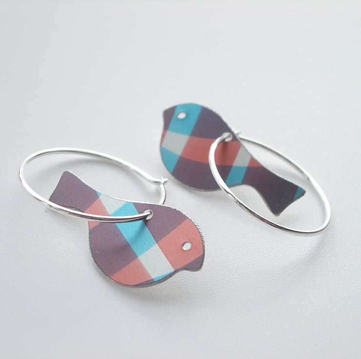 These bird earrings are made from anodised aluminium which I have dyed in ribbons of peachy pink and light blue which criss-cross each other to look like checks. I seal the dye in so that it becomes a permanent part of the metal and cut out the bird shape by hand with a piercing saw.