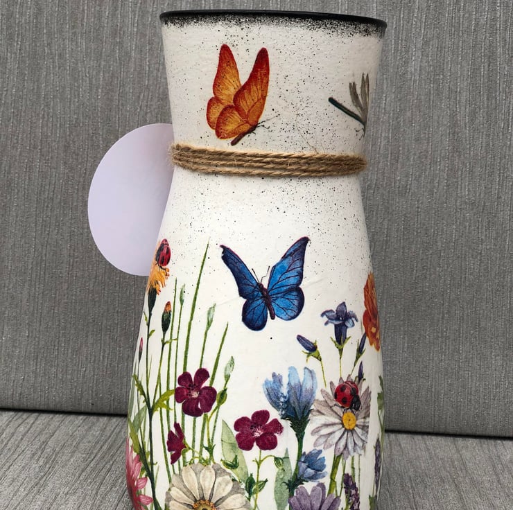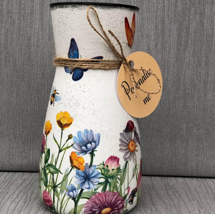 Summer Wildflowers - Butterflies - Decoupage Vase - Mothers Day , Gift For Birthday Friend Sister , Home Decor , Personalised Message