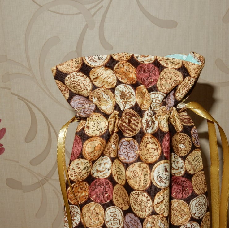 Present a bottle of fizz in a special way with this attractive re-usable fabric gift bag. This would make any special event even more exciting. The bag is made from fabric featuring wine corks.