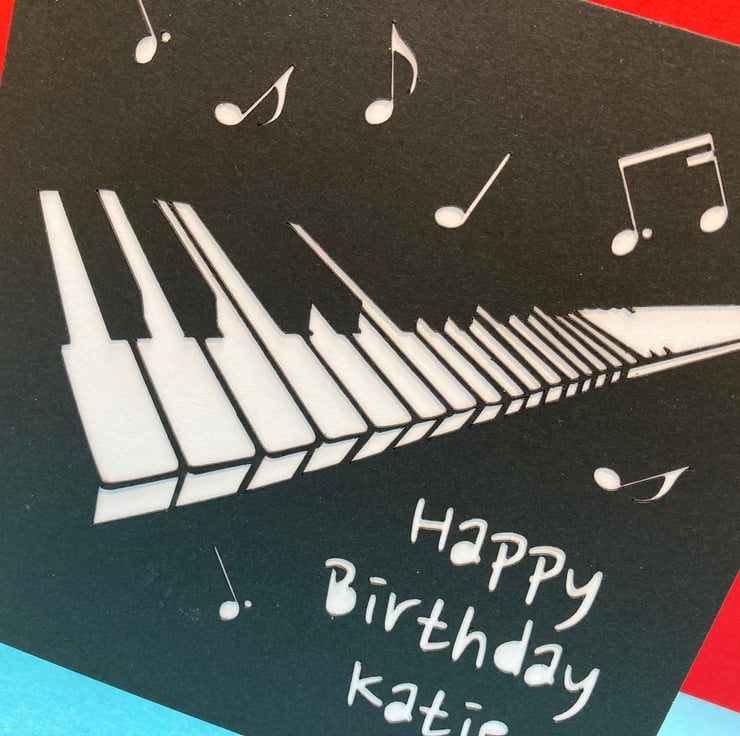 This elegant card for a pianist has been made by paper cutting a piano design onto a black card and sticking a white card behind the image which doubles up as a white insert. There is a personalised birthday message on the front.